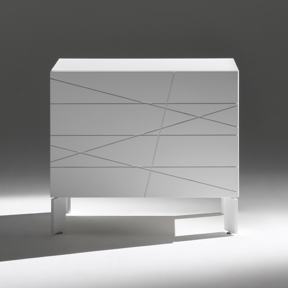 The frame is made of painted chipboard , while the MDF drawer front is finished with polyurethane paints , ensuring a durable, uniform, and high-quality surface. The engraved design on the front creates a refined graphic effect, giving the piece personality without weighing down its lines.