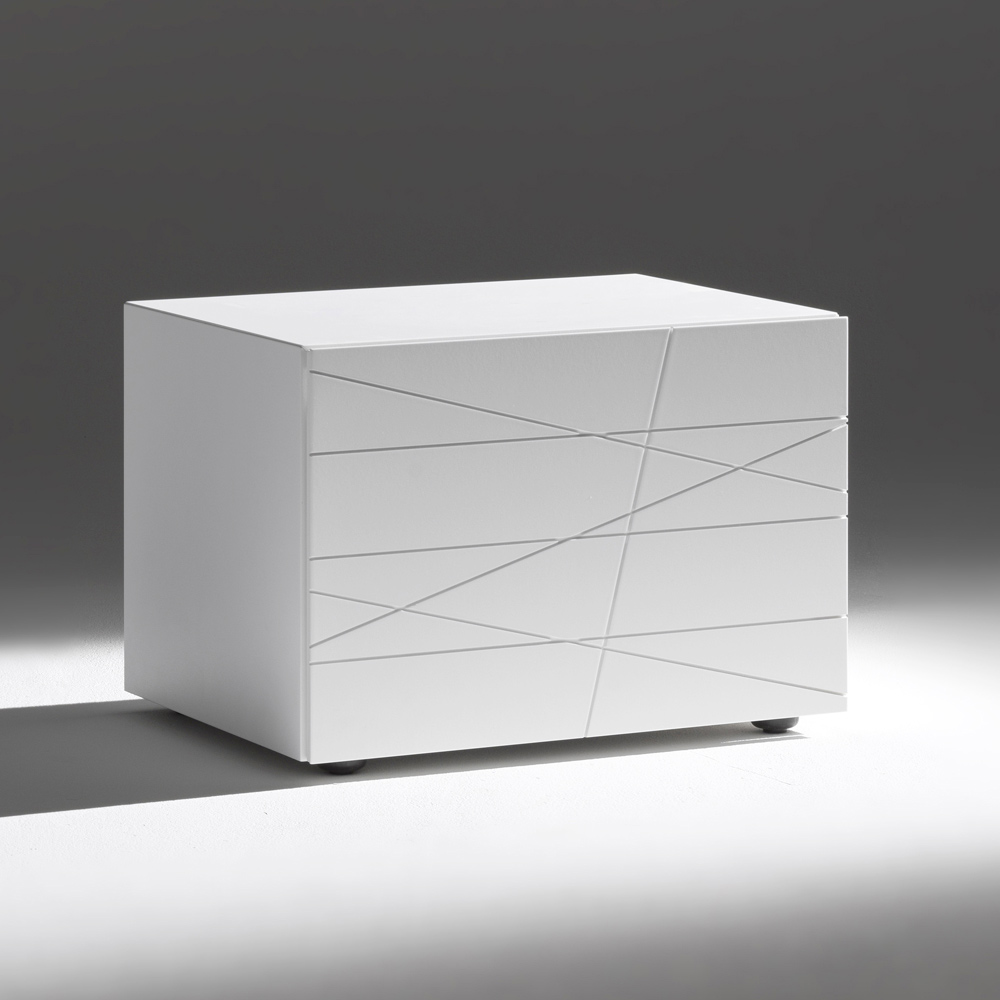 A bedside table with a contemporary and bold design, featuring a geometric aesthetic and clean surfaces that interact with light. An elegant and functional furnishing accessory, ideal for modern bedrooms and minimalist spaces.
