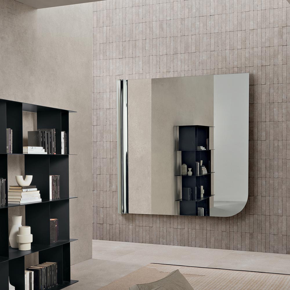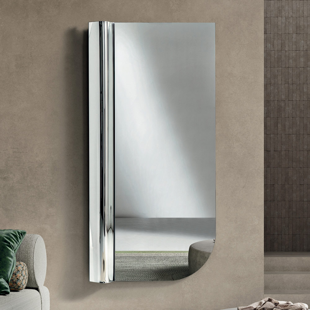 The balance between soft asymmetry and essential lines makes this mirror a sophisticated furnishing accessory, capable of enriching the wall with a modern graphic sign and amplifying the brightness of the room.