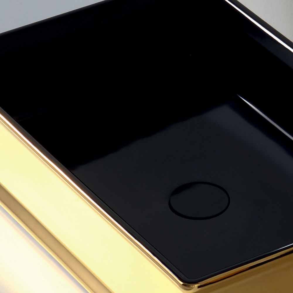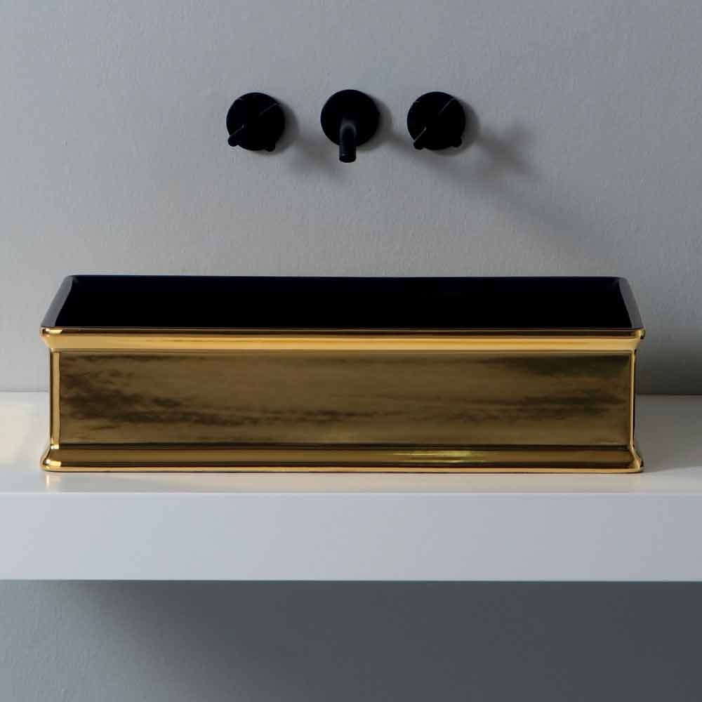 Debora is the countertop washbasin made in Italy by master craftsmen; characterized by a ceramic structure with a two-colored finish: gold and black.