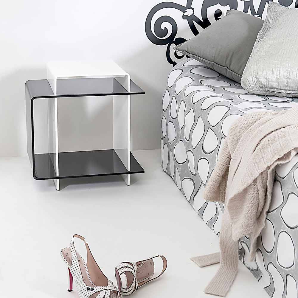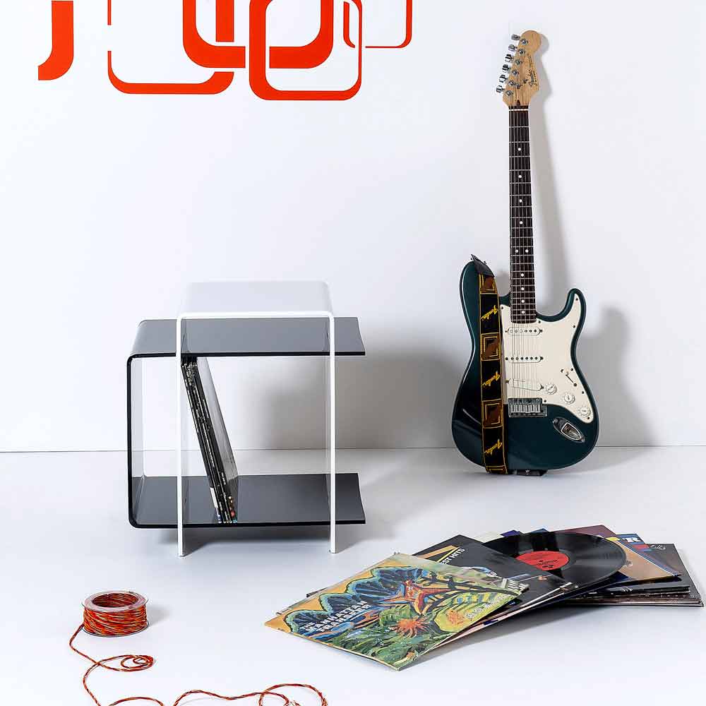 Gosto is made of 100% PMMA plexiglass from virgin polymers and it has 3 functional shelves. It can be used both as a coffee table or a bedside table. Its design is inspired by the geometries and bicolour of the '70s. Laser cut and bent at high temperatures. Self supporting.