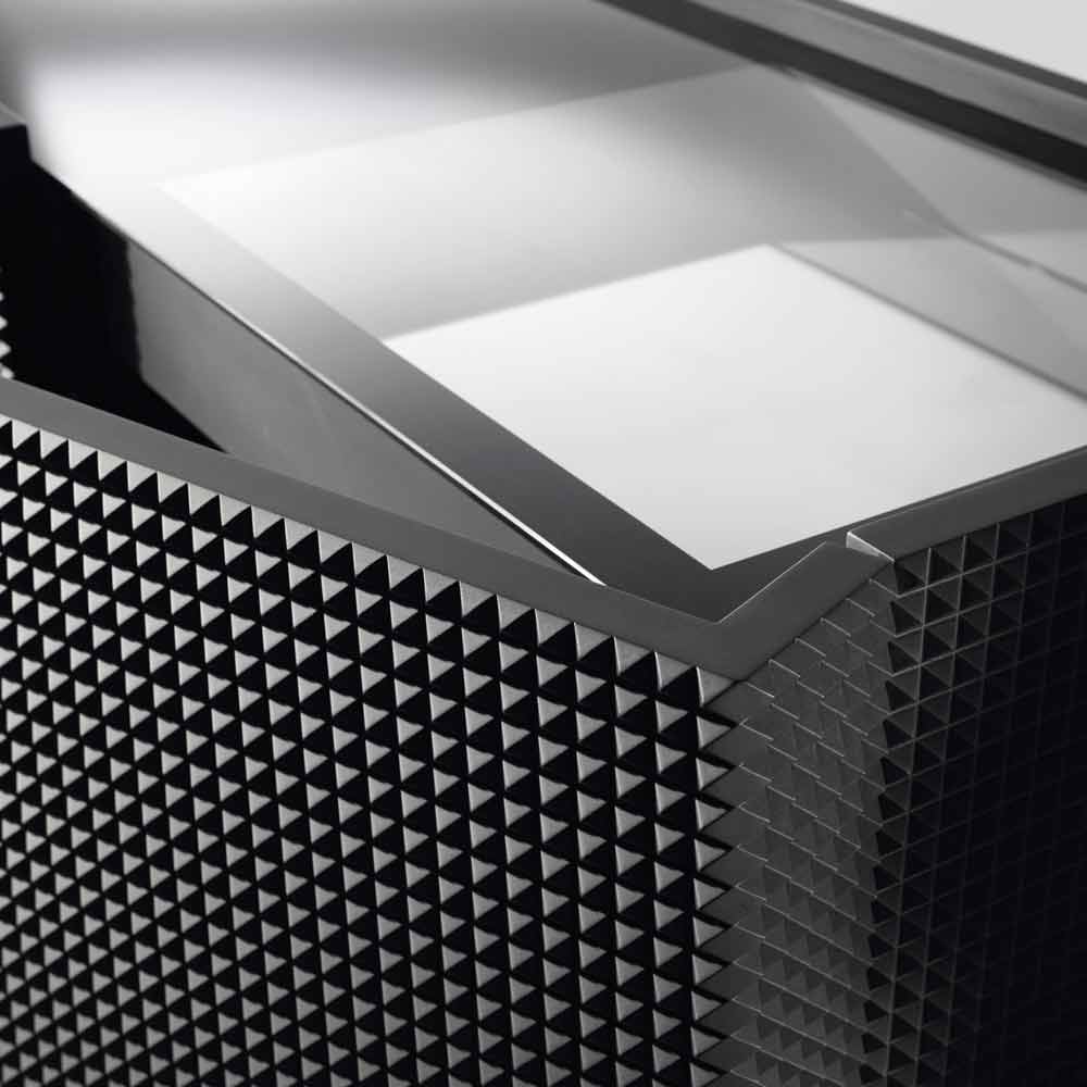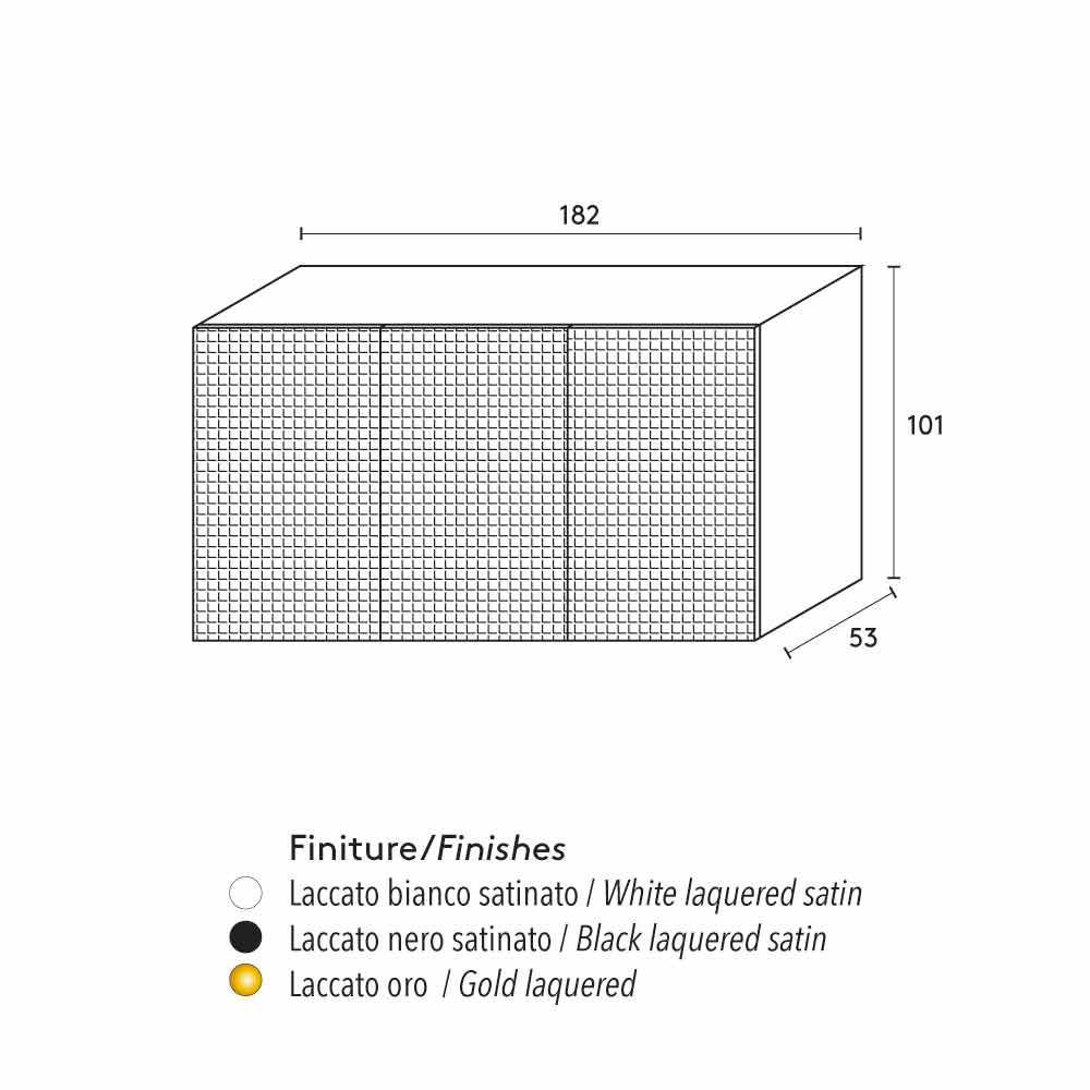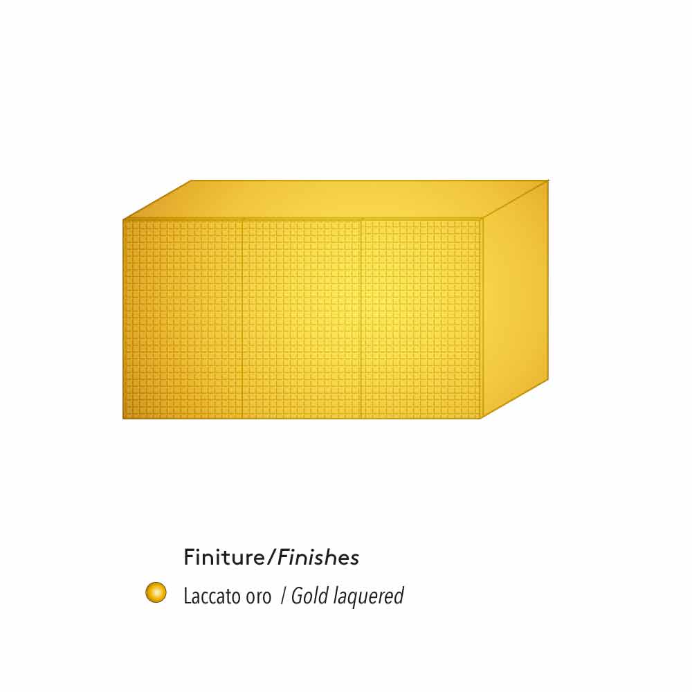 It is available with lacquered satin white, lacquered satin black or lacquered gold finish.