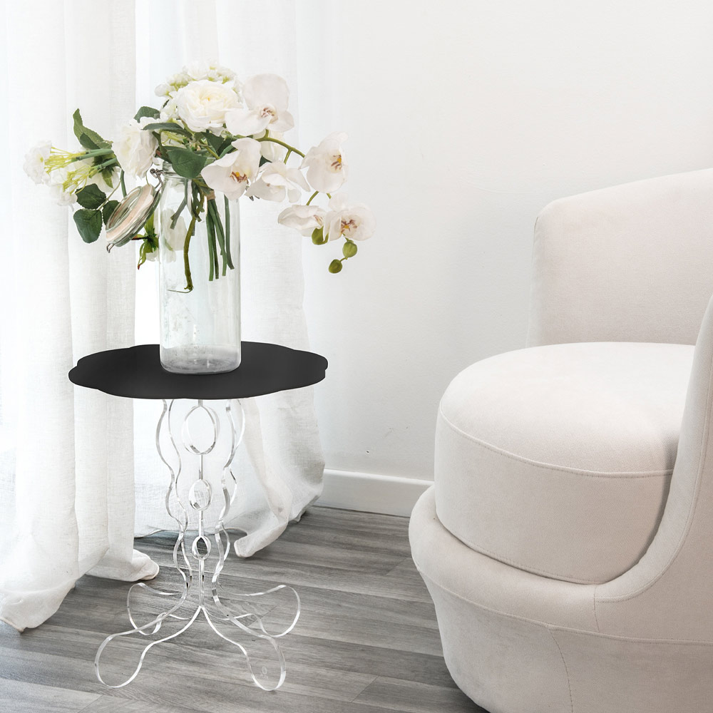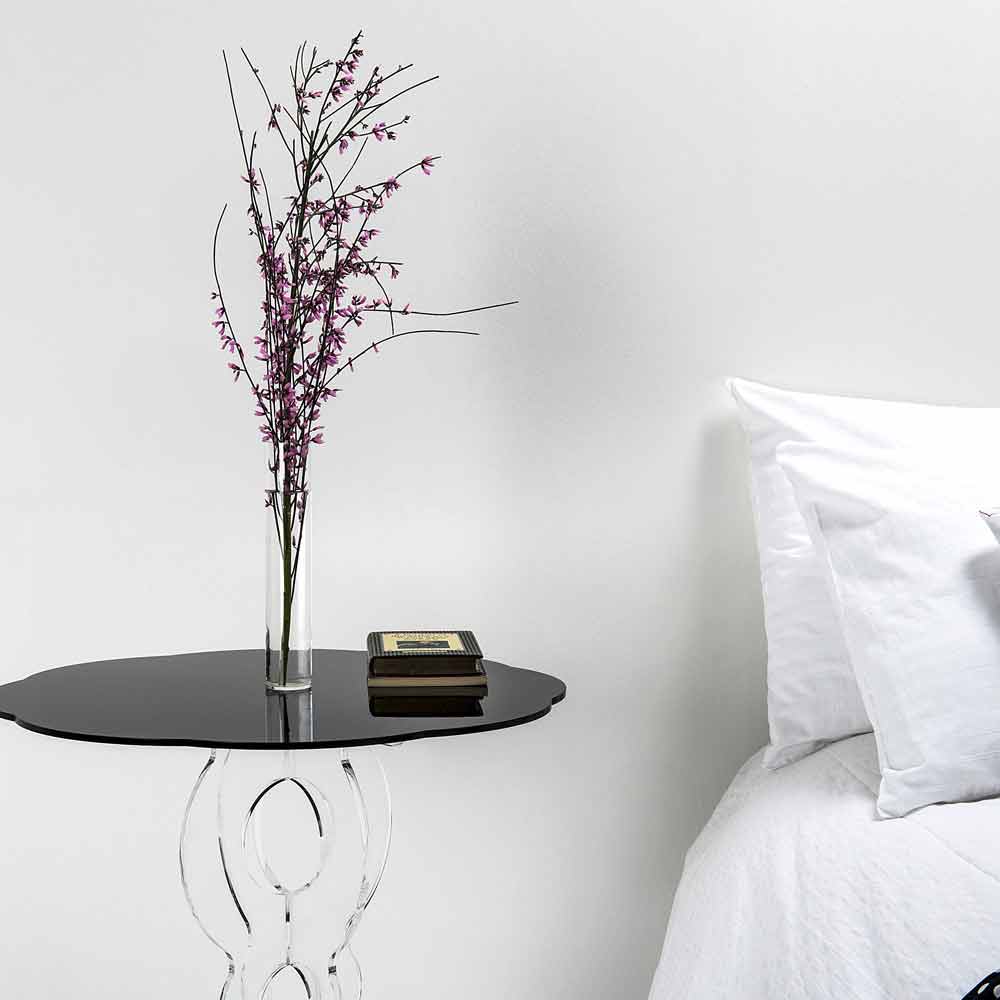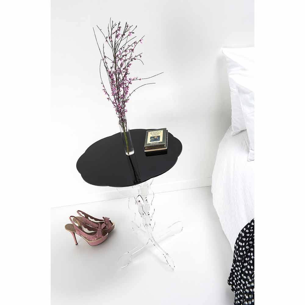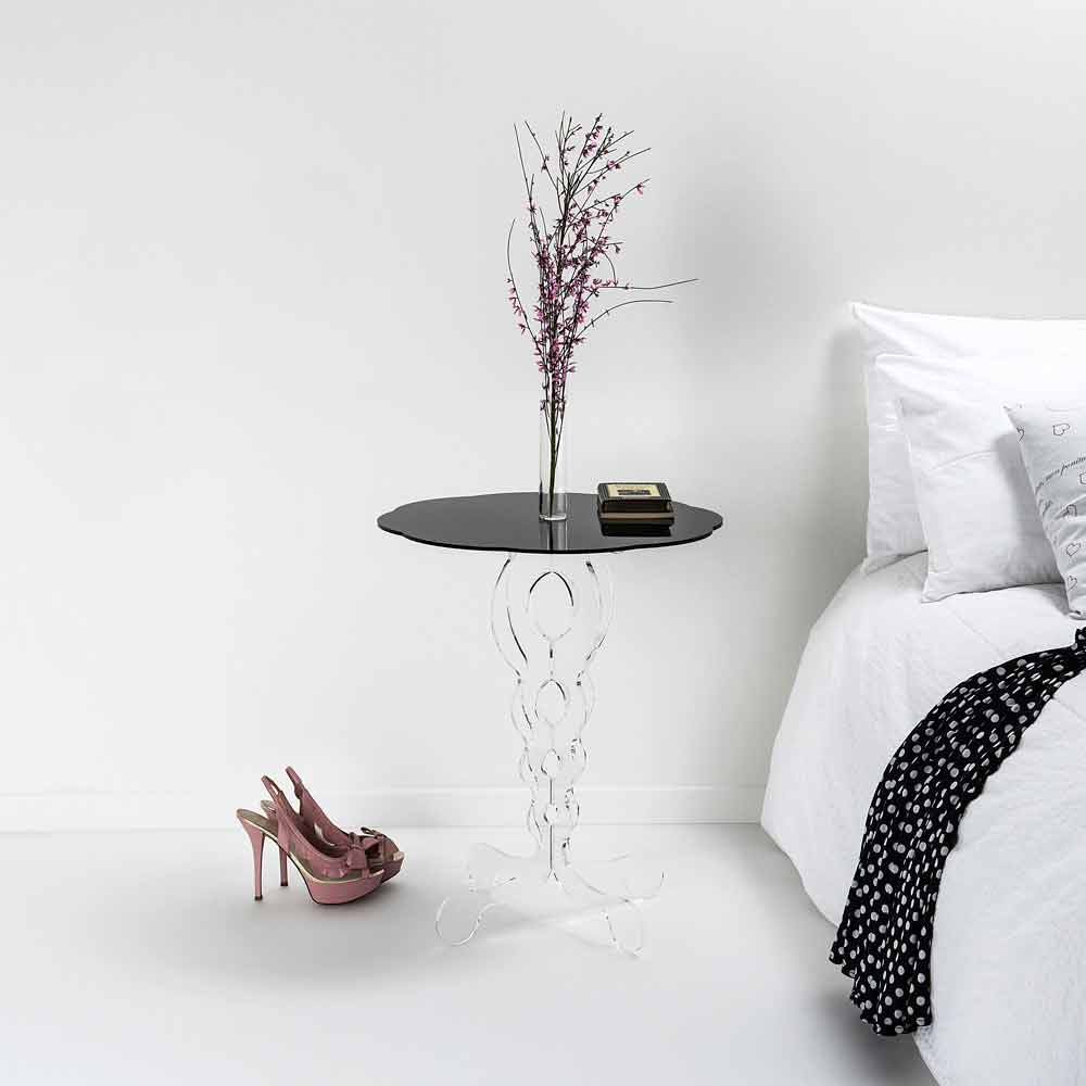 A moorish design characterises the Janis table, which can be used both as a coffee table or as a bedside table. The table base is made of laser-shaped 100% PMMA plexiglass. The table top gives a touch of color to the environment.