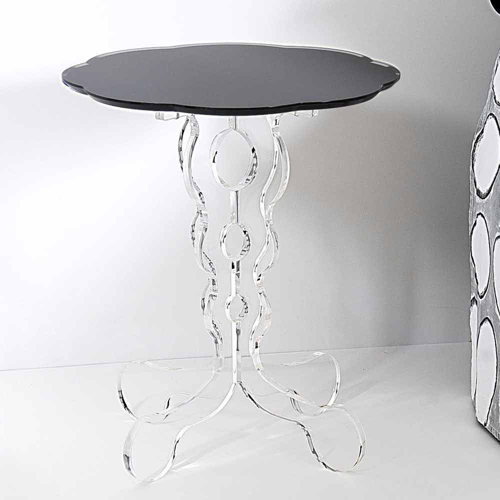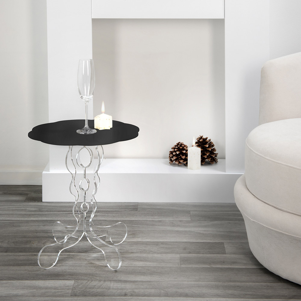 A moorish design characterises the Janis table, which can be used both as a coffee table or as a bedside table. The table base is made of laser-shaped 100% PMMA plexiglass. The table top gives a touch of color to the environment.