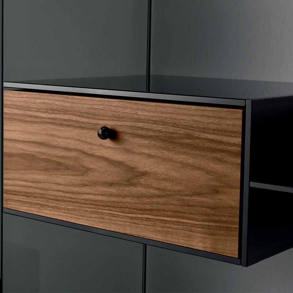 A drawer in canaletto walnut wood with a gunmetal finish knob is included that can be positioned as desired in the two reference compartments. The permissible load for each shelf is 15 kg.
