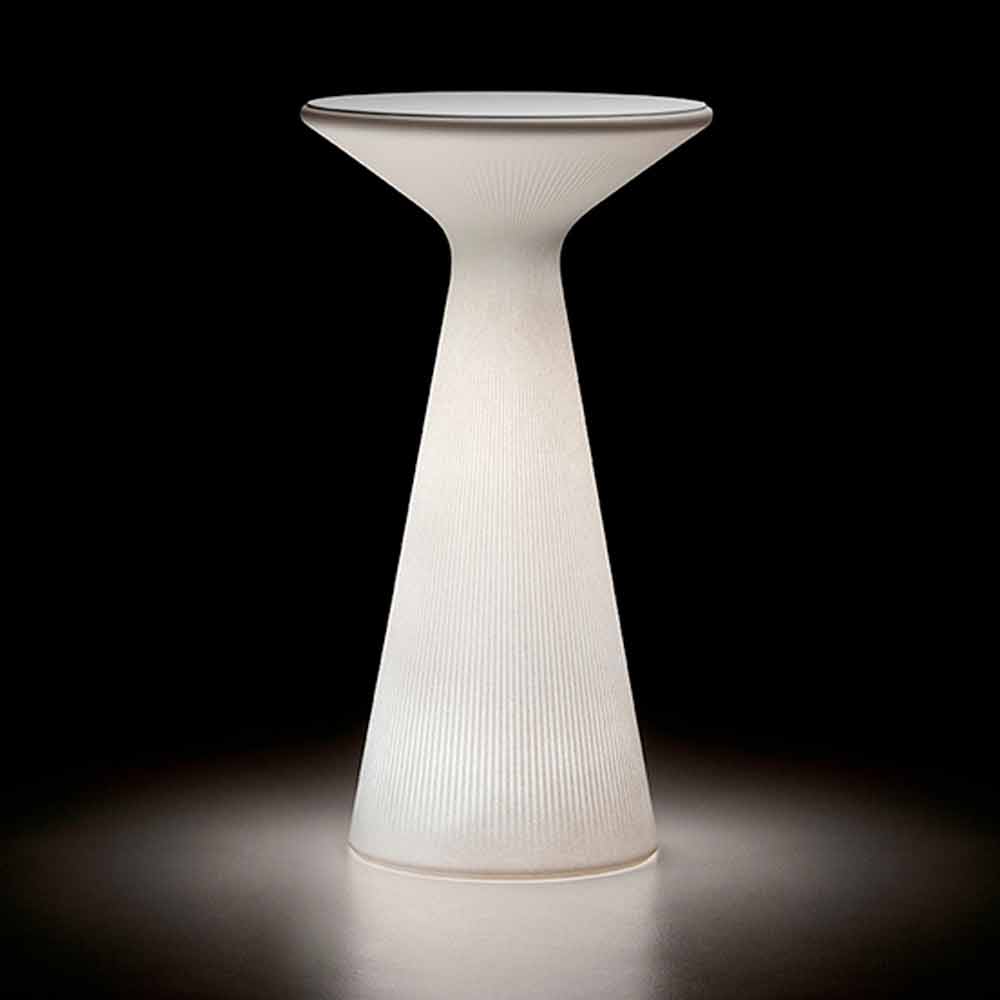 Round outdoorcoffee table made in Italy with polyethylene structure and white HPL top. Simplicity and functionality distinguish this modern high table ideal to be used as a practical support surface but at the same time capable of playing a purely decorative role thanks to its innovative and original design. The particular striped surface that covers the entire base of the product makes the aesthetics of the coffee table interesting, enriched by the RGB LED light which, illuminating the structure, gives life to ideal atmospheres for spending wonderful evenings in company in domestic spaces such as gardens and terraces but also in contract environments where it is necessary to find a furnishing solution that is as functional as it is aesthetically appealing.