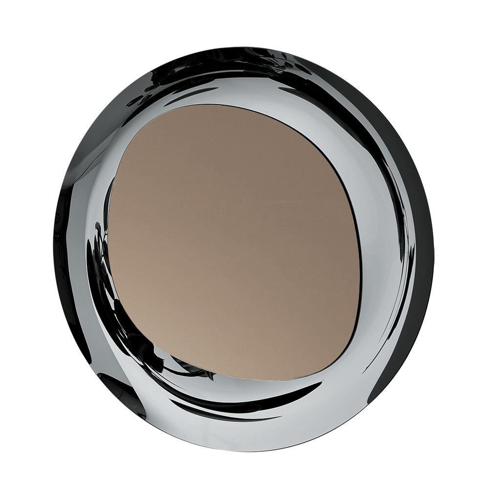 The mirror features a shaped bronze-finish plate resting on a round smoked glass frame . The intersection of the surfaces and different volumes creates an elegant interplay of contrasts between form and material, resulting in a sophisticated and timeless object capable of embellishing any wall.