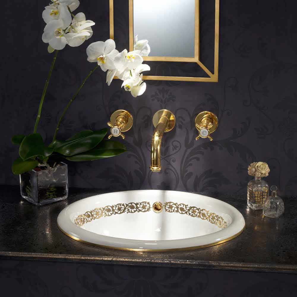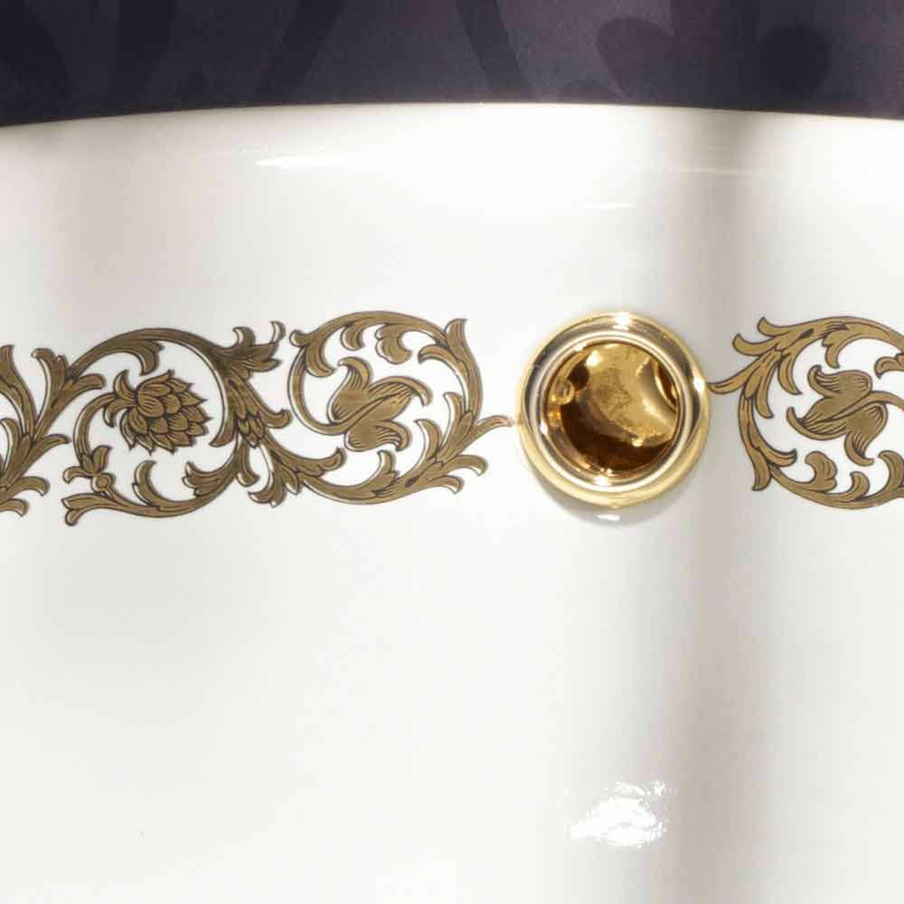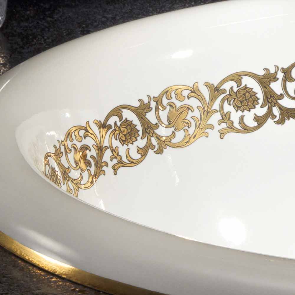 Bathroom built-in sink made in Italy in fire clay, hand made, decorated, with stripe in gold pine cone and 24k gold edge.