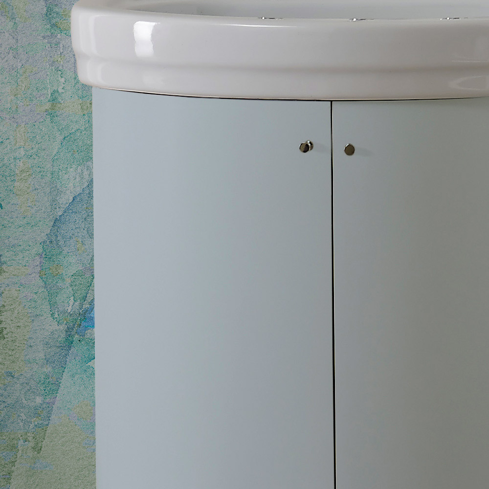 Bathroom cabinet in MDF with two doors with cannetté workmanship , matt finish, one shelf in MDF Idro, complete with white ceramic sink and nickelknobs included with legs in matt white MDF .