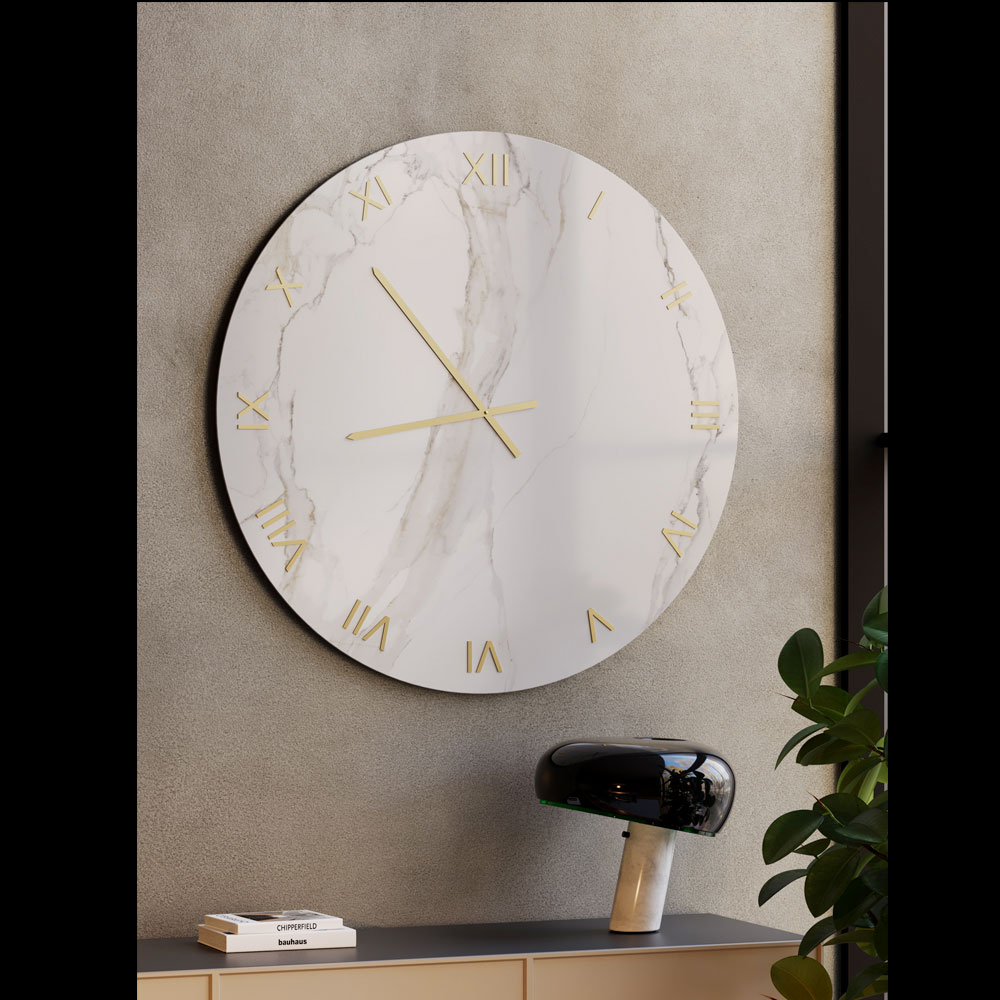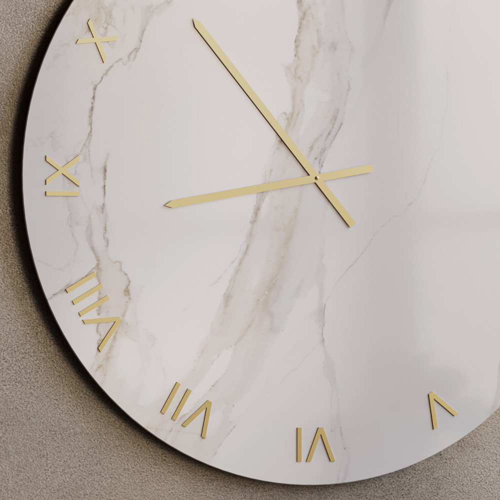 The glass wall clock with a silkscreened Calacatta marble-effect finish is a refined piece of furniture, designed to enhance modern and contemporary spaces with a touch of timeless luxury. The glass surface highlights the delicate veining inspired by natural marble, creating an elegant interplay of light and depth.