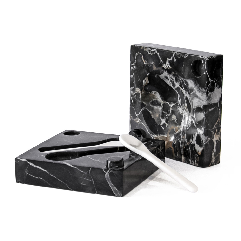 Portoro marble caviar holder with white Carrara spoons, made in Italy design.