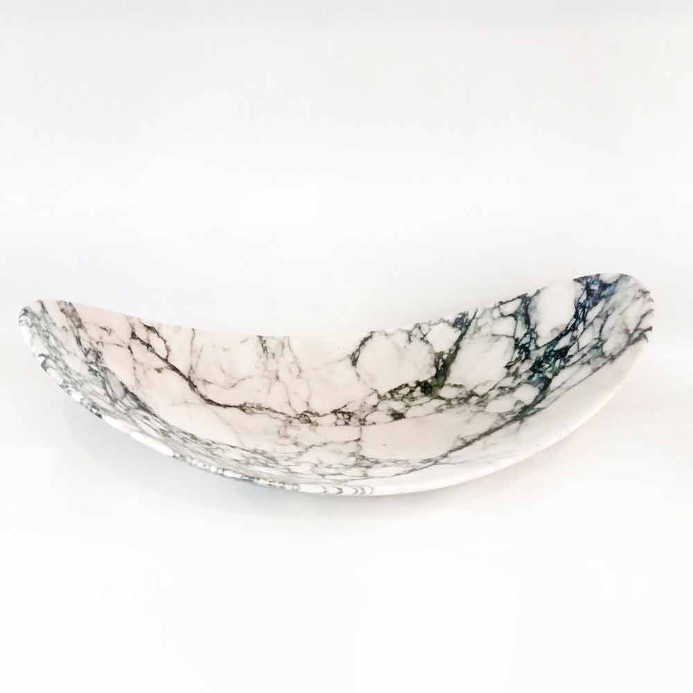 Centerpiece characterized by a sophisticated design and its shape with sinuous and harmonious lines that give a light and modern look to the product. Made in Italy by hand in Paonazzo marble , a compact, fine-grained material with an ivory base tending to beige-yellow and purplish red with veins in shades of black, greenish.