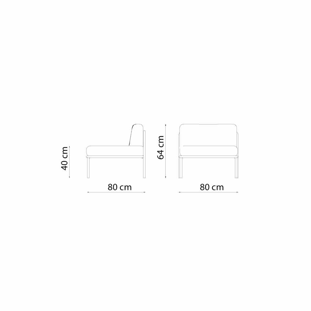Central modular outdoor armchair completely made in Italy with quality raw materials ideal for creating elegant and unique living room compositions. Thanks to its minimal but refined design and the colors available, it is versatile and therefore adaptable to fun types of environments, focusing attention on the essential characteristics of the lines.