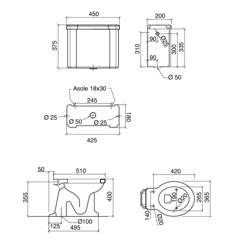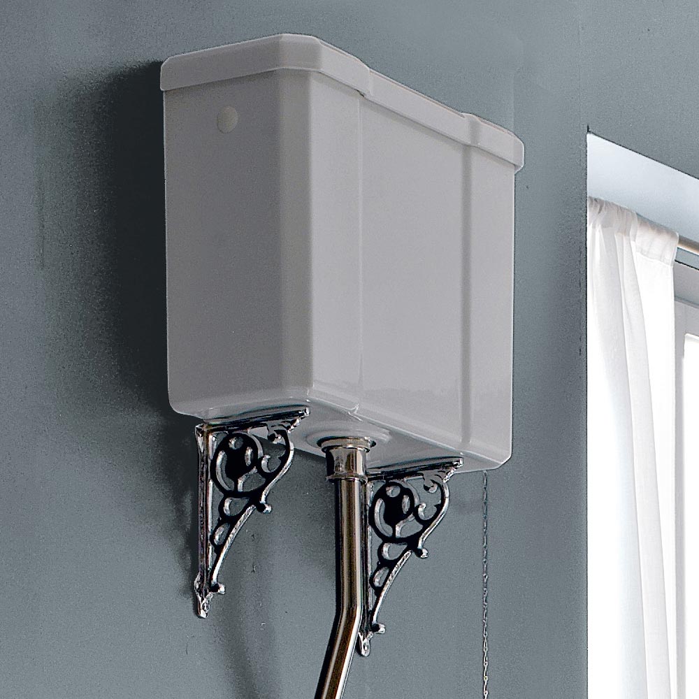 Classic style floor standing WC with high white Marwa ceramic box, made in Italy.