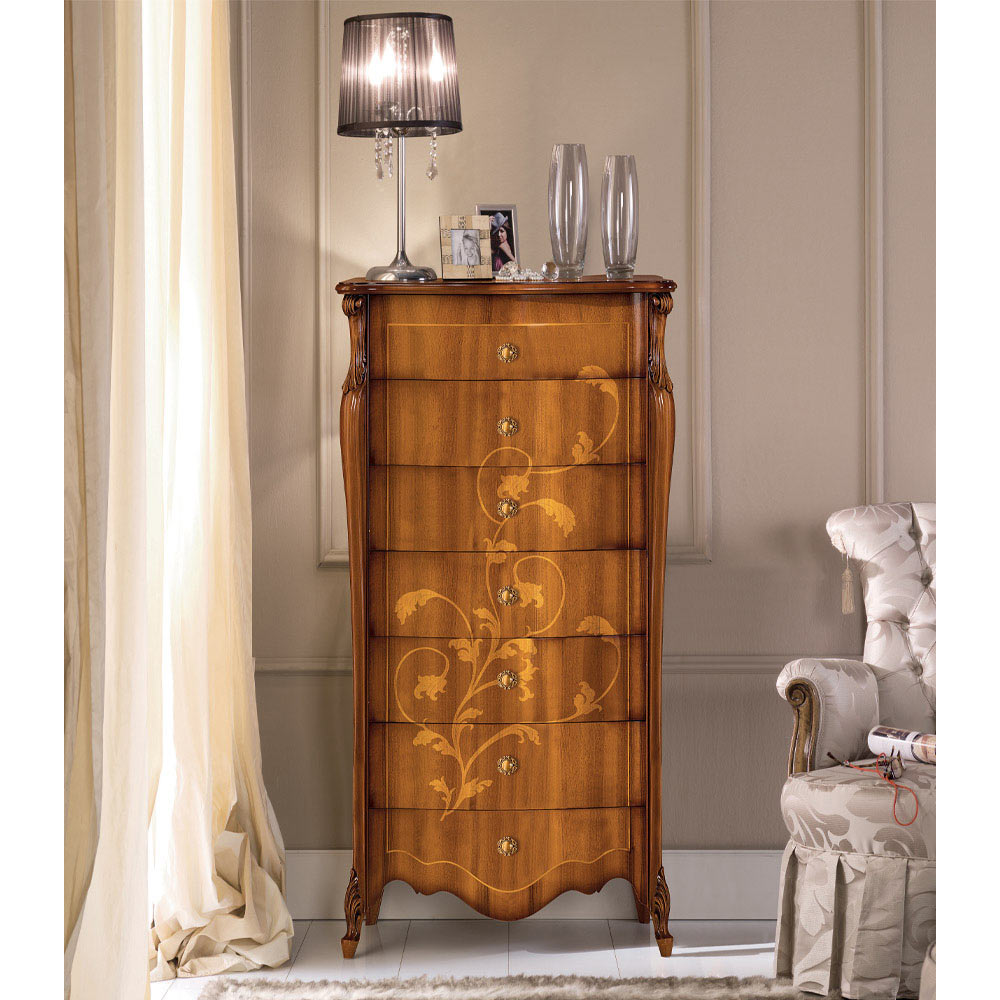 Chest of drawers with a timeless classic style equipped with 7 practical drawers and made of Bassano walnut finish wood with inlays . The chest of drawers is available in two different sizes, to better adapt to every need. A unique and refined complement, completely made in Italy by skilled master craftsmen , masters of art who finish each complement with wisdom and taste for elegance. The production is carried out using fine materials , and performing the workbyhand with the utmost care and professionalism that distinguishes Made in Italy products.
