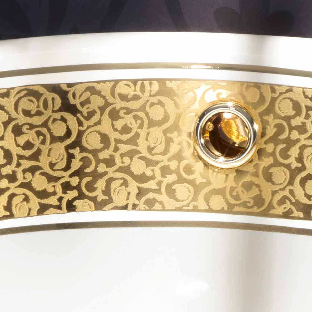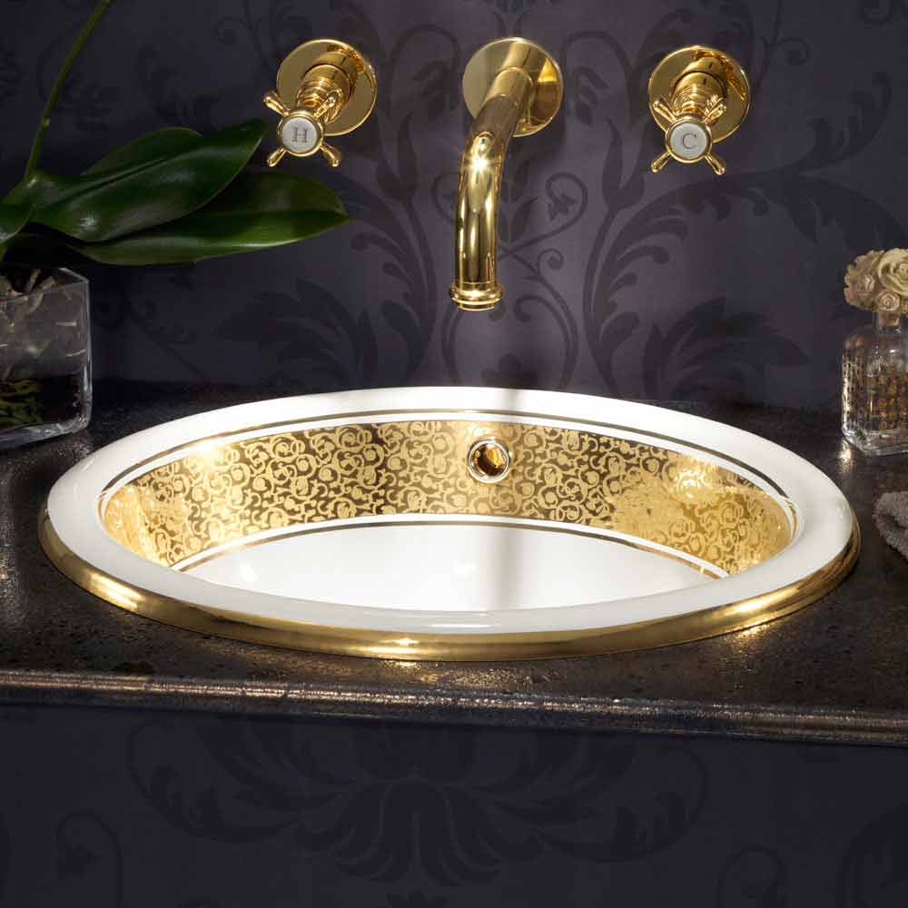 Bathroom built-in sink made in Italy handmade in fire clay, decorated with a golden stripe in relief, two braids and a 24k gold edge.