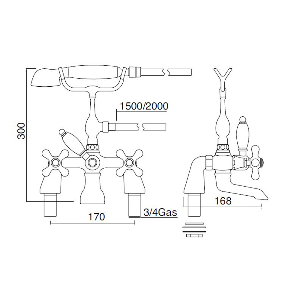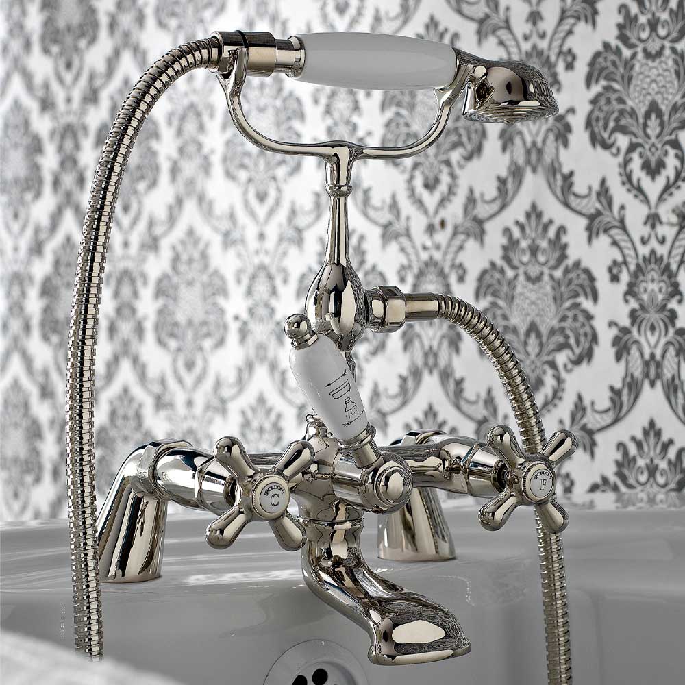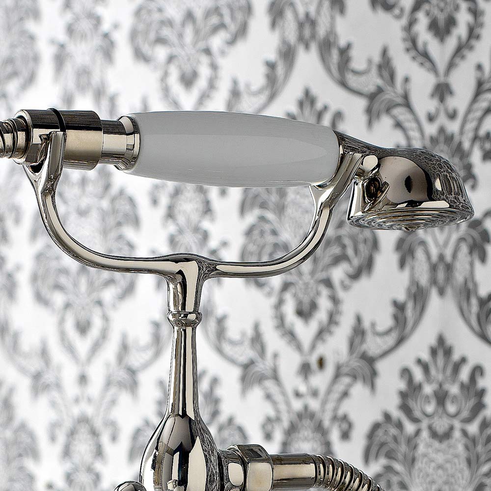 Classic bathroom rim tap with handcrafted brass hand shower made in Italy.