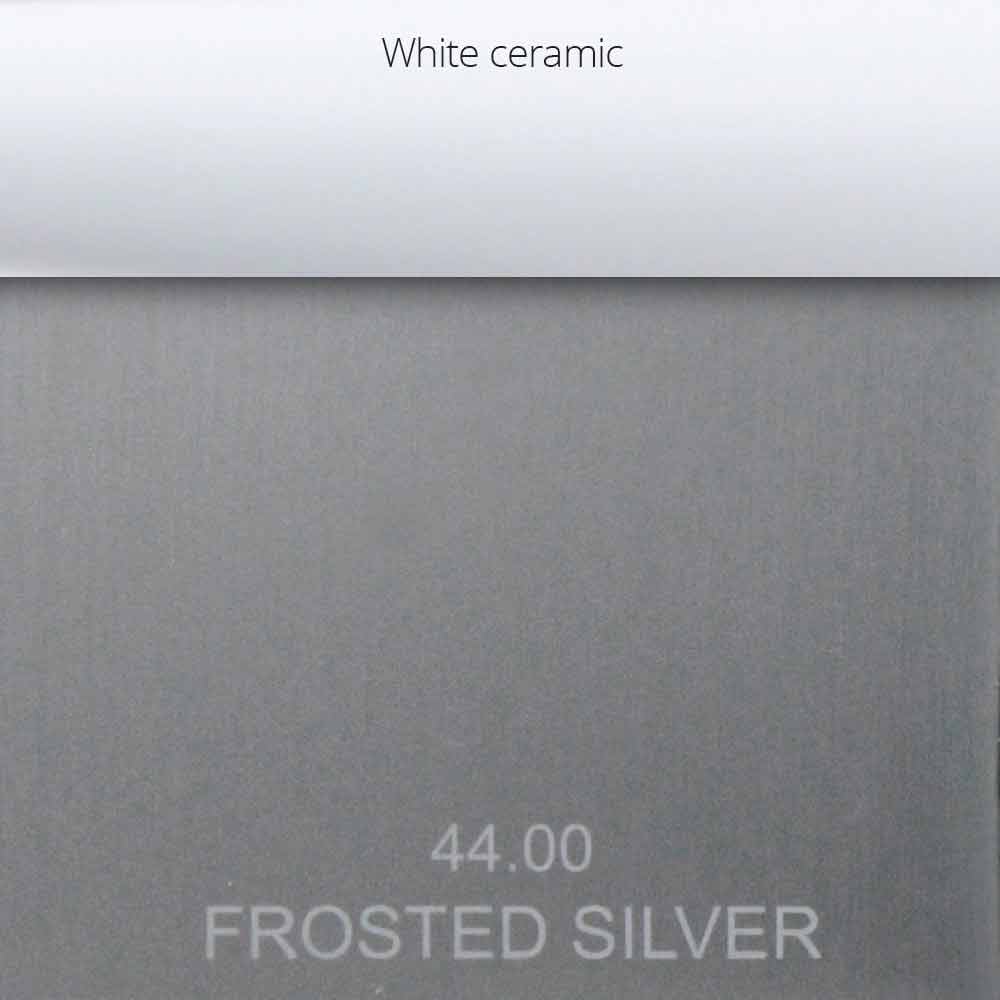 Frosted Silver: matt brushed silver finish with white ceramic inserts on the handles;