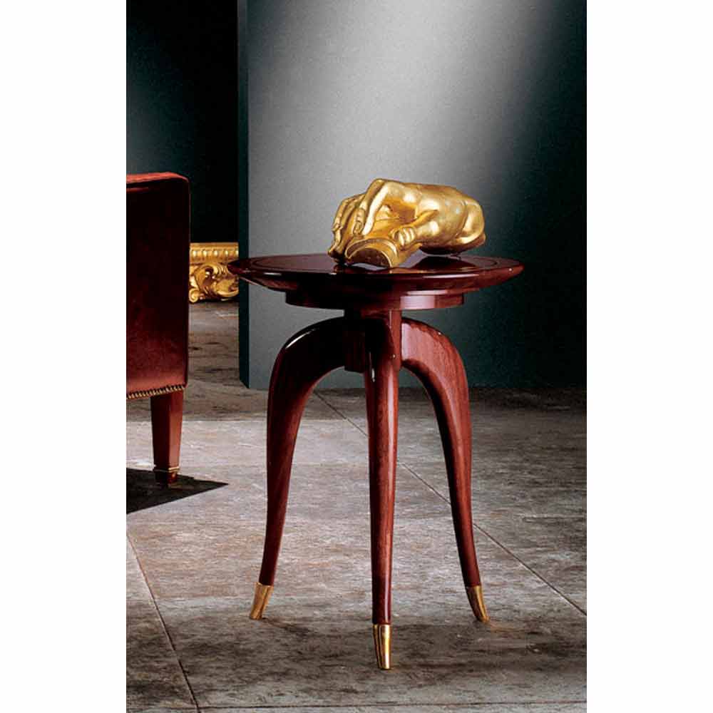 Round design wooden coffee table, diameter 40 cm, Clay Clay is a design coffee table characterized by a classic style, revisited in a modern way. It is entirely handcrafted in Italy. Round coffee table with 3 legs. Finish in polished natural mahogany.