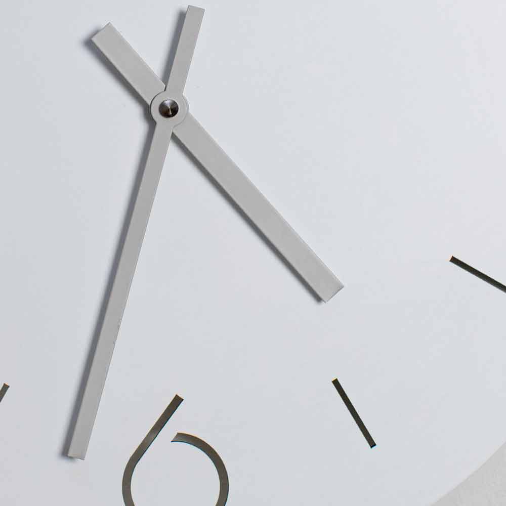 A round clock with simple and clean lines in matte white for a classic and basic design with beige hands. The details are mainly rendered thanks to the laser: the numbers and lines are in fact laser-cut to be placed on a colored wall and create contrast.