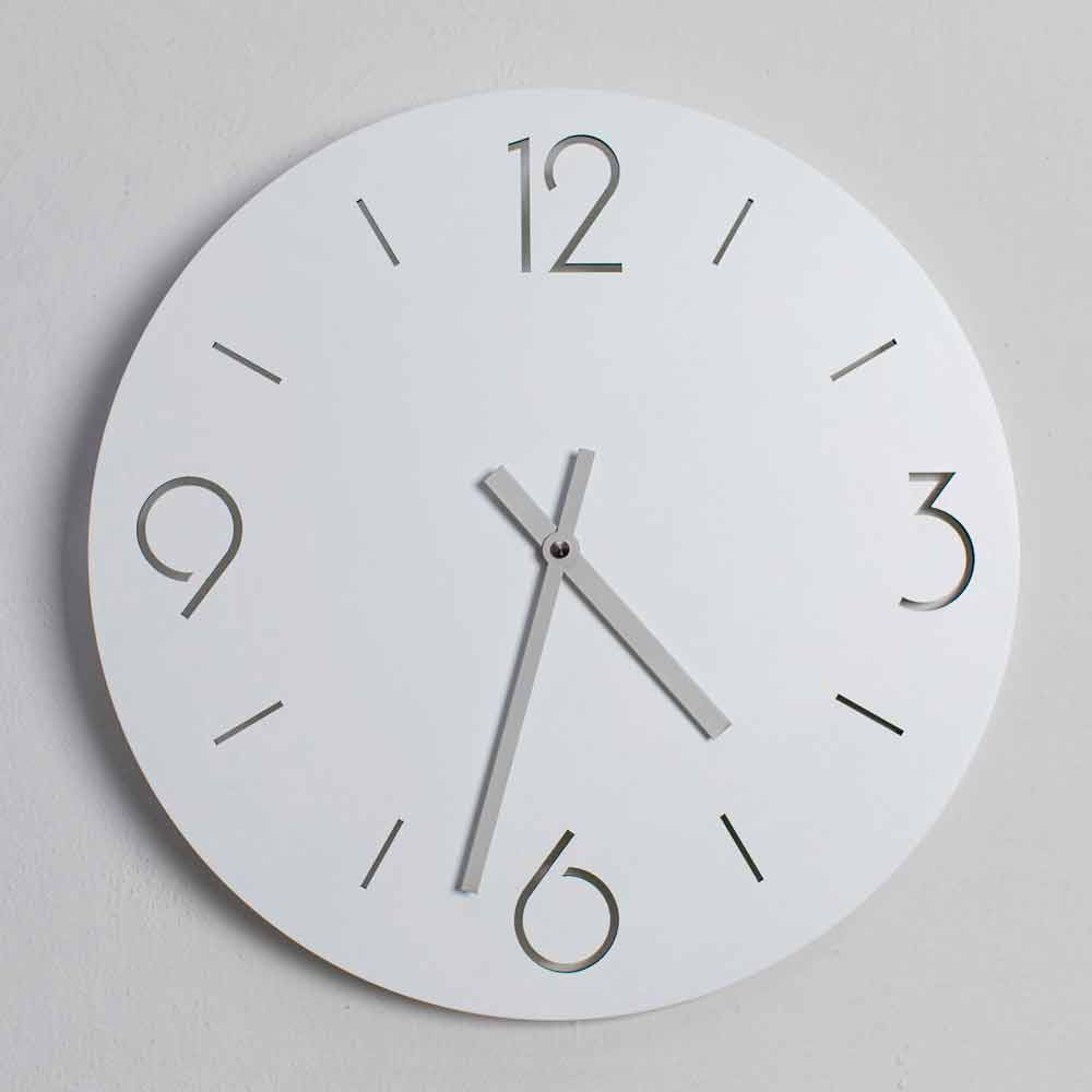 Basic and round design wall clock in white lacquered and laser cut wood, made in Italy.