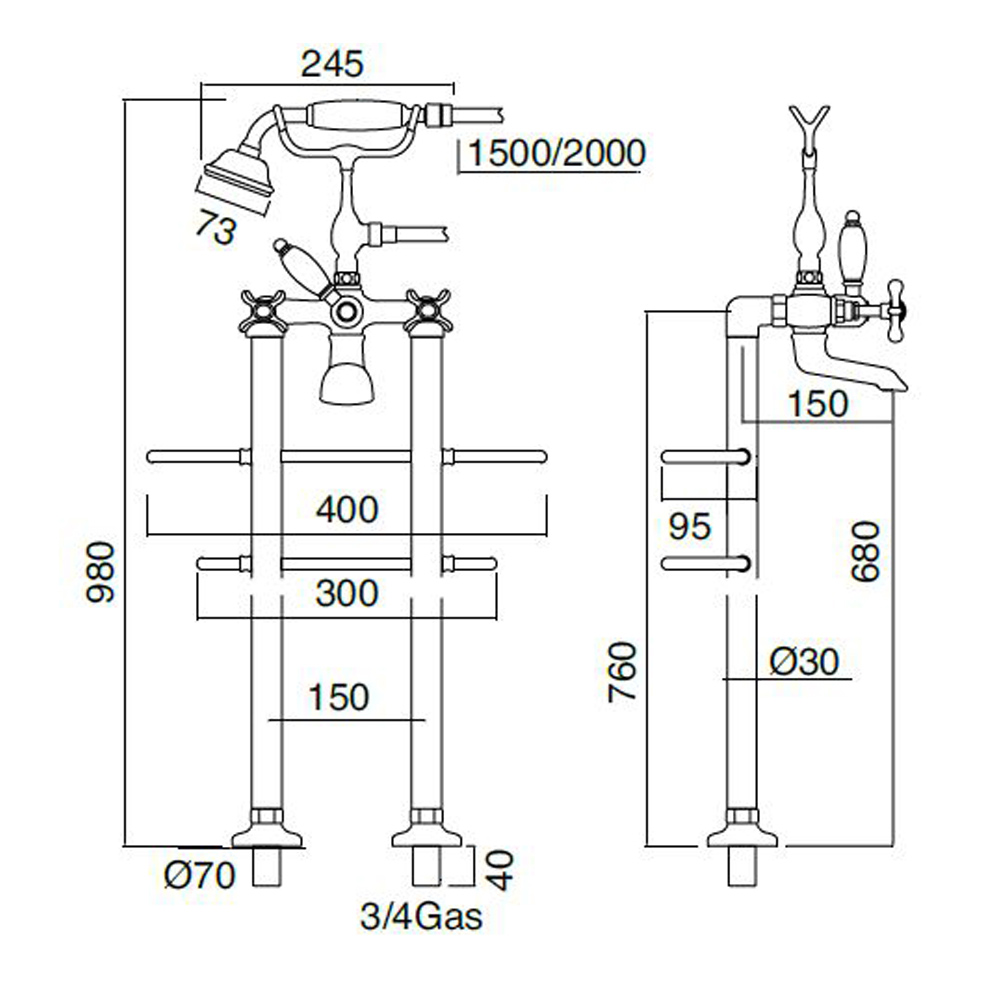 standing bathtub set with towel rail, hand shower and flexible hose is entirely