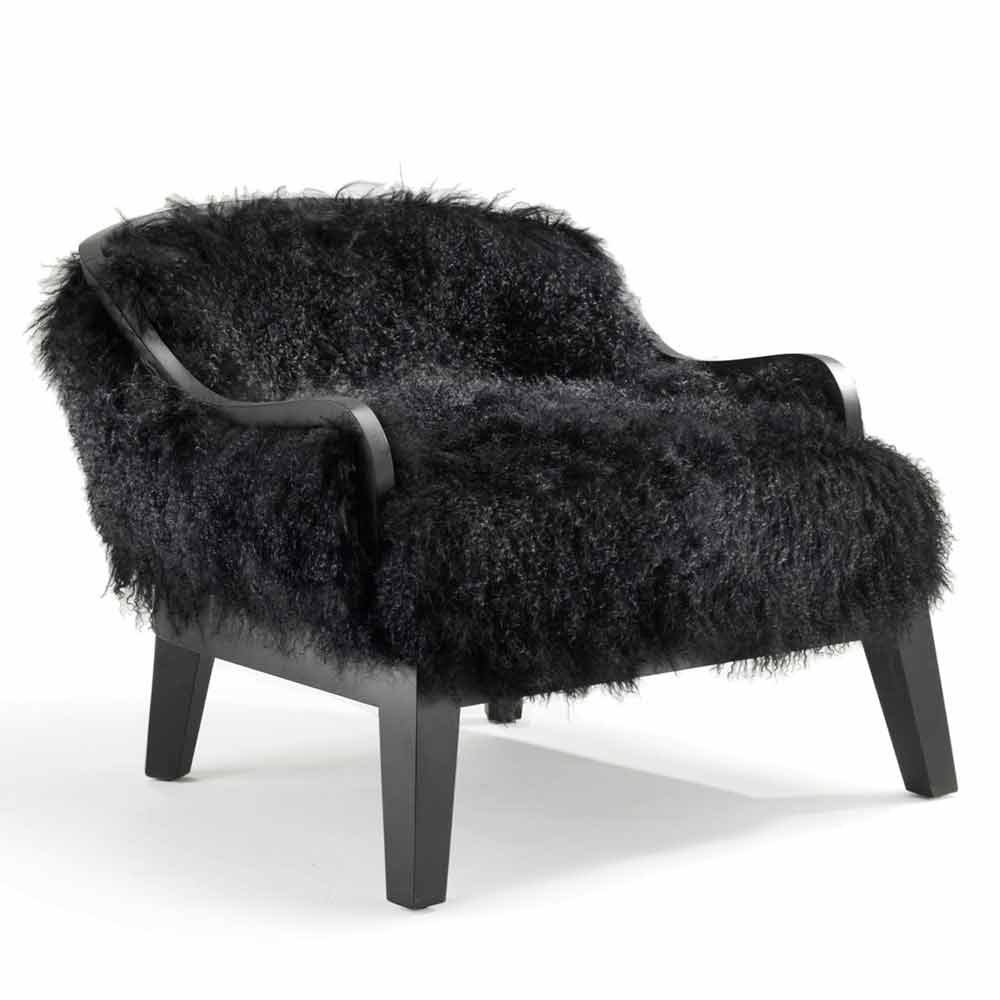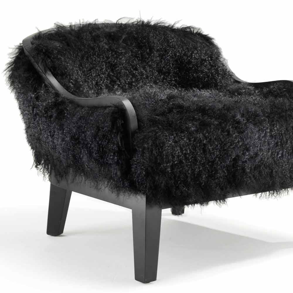 Low armchair in black leather and fur, made in Italy, Eli Low armchair. Retro back covered in leather. Front seat and back covered with black tibet lamb hair. Wooden frame and base. Finish in black oak.