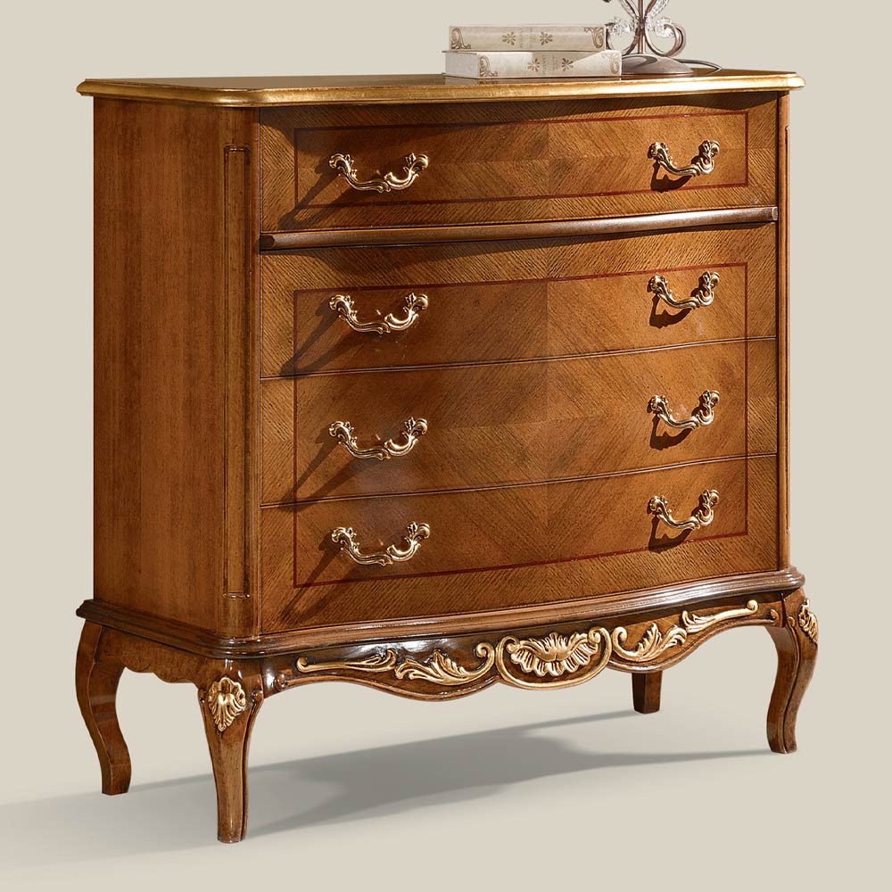 Classic styleliving room sideboard made with precious wood available in white finishes with silver details or Bassano walnut with herringbone inlays and gold details, a refined complement able to enrich the living area by inserting itself with elegance and sobriety. Completely made in Italy and handcrafted by skilled master craftsmen , finished with wisdom and taste for elegance. The production is carried out using fine materials , and performing the workbyhand with the utmost care and professionalism that distinguishes Made in Italy products.