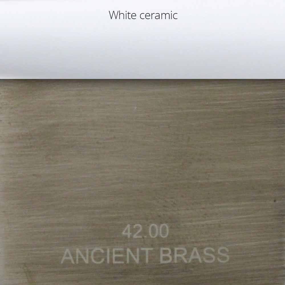 Ancient Brass: matt brushed antique brass finish with white ceramic inserts on the handles;