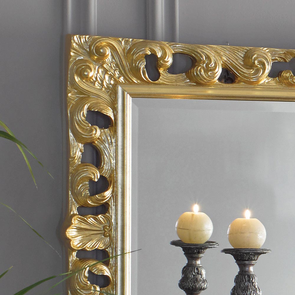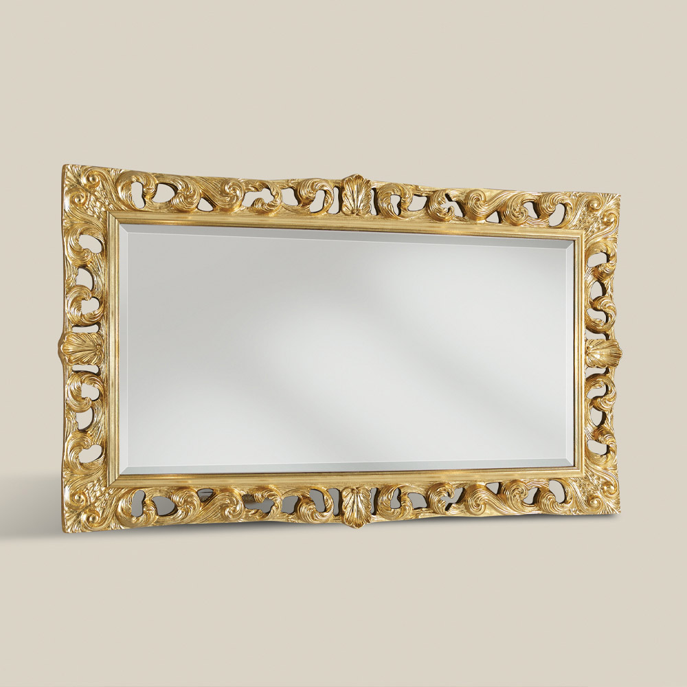 Classic rectangular mirror with wooden frame decorated in gold leaf . With its elegant and harmonious shapes , it is ideal for giving any environment a classic and luxury touch. A unique and refined complement , completely made in Italy by skilled master craftsmen , masters of art who finish each complement with wisdom and taste for elegance. The production is carried out using fine materials , and performing the workbyhand with the utmost care and professionalism that distinguishes Made in Italy products .
