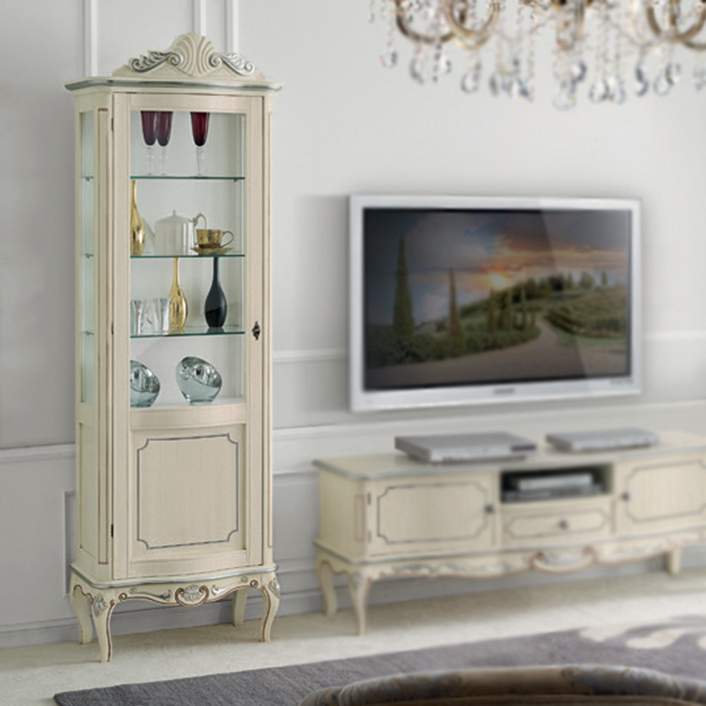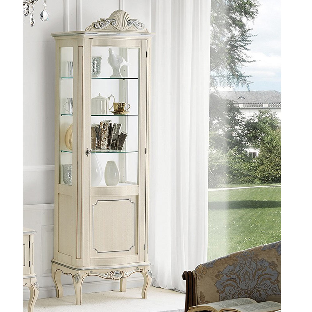 Living room display cabinet made of precious wood available in Bassano walnut, white or mocha finishes and in the version with door opening to the right or to the left. Elegant and timeless, this classic style display cabinet is ideal for creating impressive settings. Completely made in Italy and handcrafted by skilled master craftsmen , finished with wisdom and taste for elegance. The production is carried out using fine materials , and performing the workbyhand with the utmost care and professionalism that distinguishes Made in Italy products.
