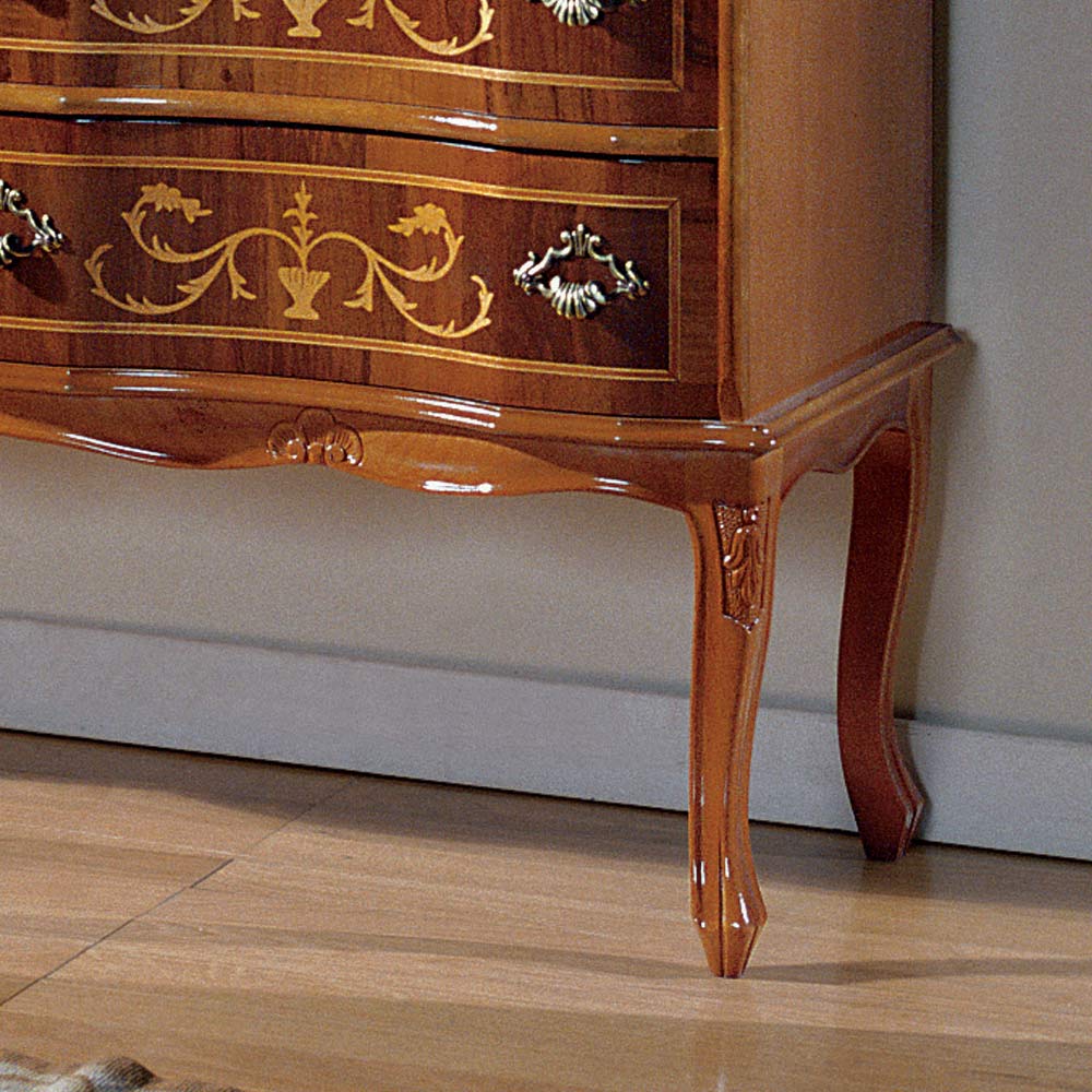 Classic style chest of drawers made of precious polished walnutwood with golden inlays . This practical and refined piece of furniture with 6 drawers is completely made in Italy and handcrafted by skilled master craftsmen , finished with skill and taste for elegance. The production is carried out using fine materials , and performing the workbyhand with the utmost care and professionalism that distinguishes Made in Italy products.