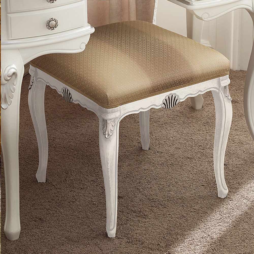 Classic style pouf made of wood, padded and covered in fabric , available in Bassano walnut wood finishes with antique gold details or white wood and silver details. A unique and refined complement, completely made in Italy by skilled master craftsmen , masters of art who finish each complement with wisdom and taste for elegance. The production is carried out using fine materials , and performing the workbyhand with the utmost care and professionalism that distinguishes Made in Italy products.