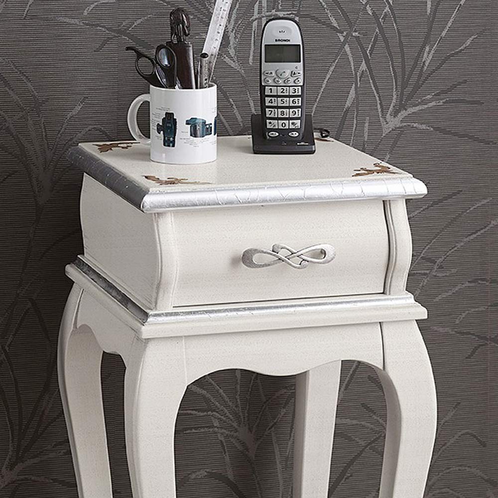 Luxury living room telephone table made of precious wood available in walnut or white and silver finishes. Unique and refined, it is completely made in Italy by skilled master craftsmen , finished with wisdom and taste for elegance. The production is carried out using fine materials , and performing the workbyhand with the utmost care and professionalism that distinguishes Made in Italy products.
