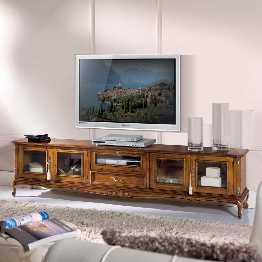 Elegant TV cabinet designed to furnish the living room through a touch of classic style made of precious Bassano walnut wood. This practical complement also features 4 glass doors, 1 drawer and 1 flap. Unique and refined, it is completely made in Italy by skilled master craftsmen , finished with wisdom and taste for elegance. The production is carried out using fine materials , and performing the workbyhand with the utmost care and professionalism that distinguishes Made in Italy products.