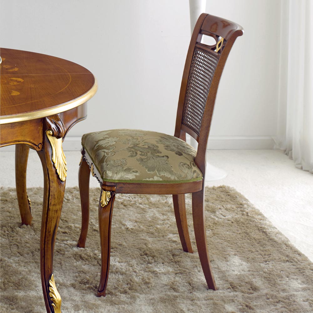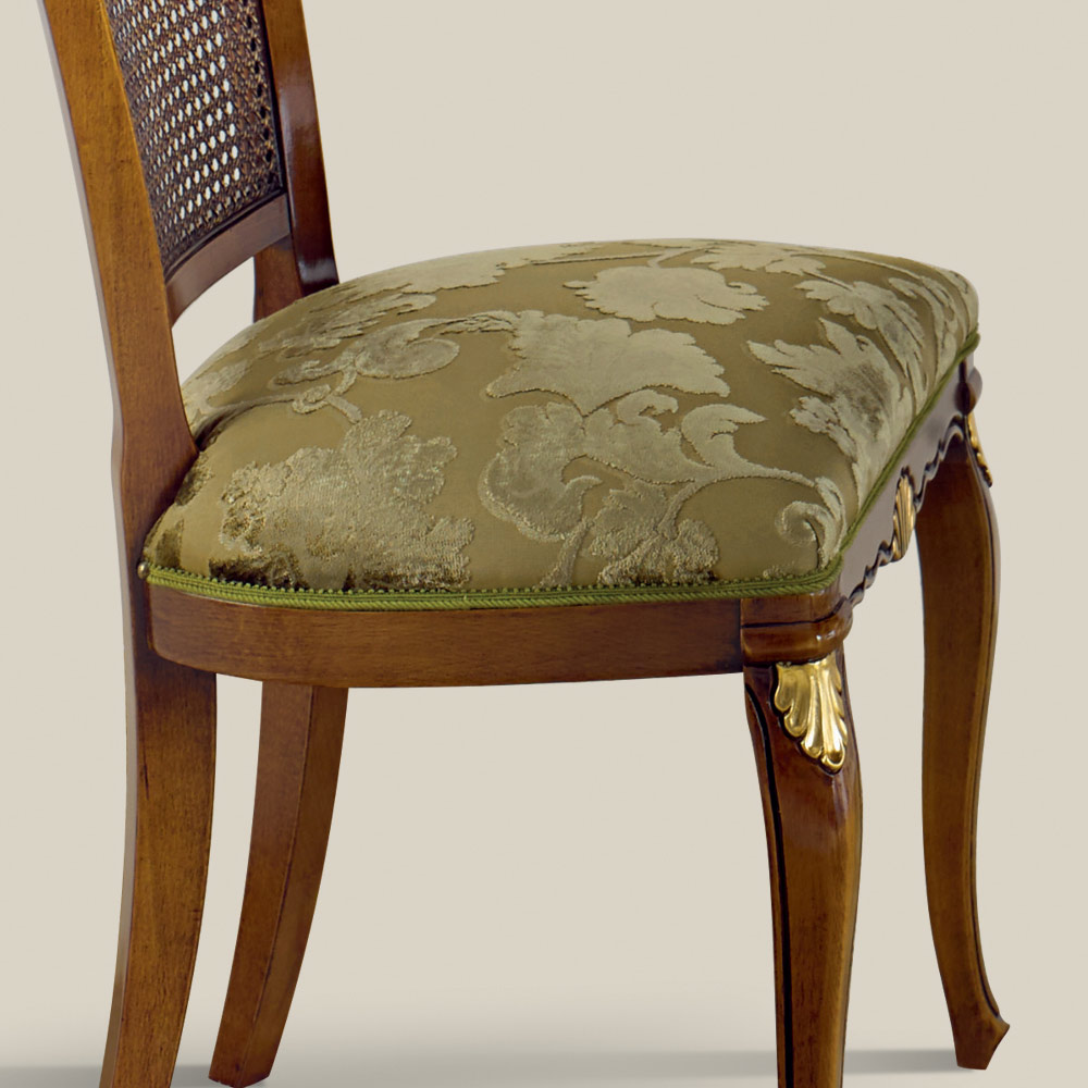 Dining room chair with atimeless classic style , perfect for decorating any living area with personality and elegance . This chair has a structure made of wood with Bassano walnut and antique gold finish and a seat with a padded seat covered in fabric with a backrest made of Vienna straw . It is also possible to choose between the version with or without armrests.