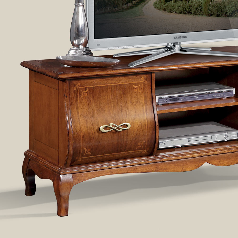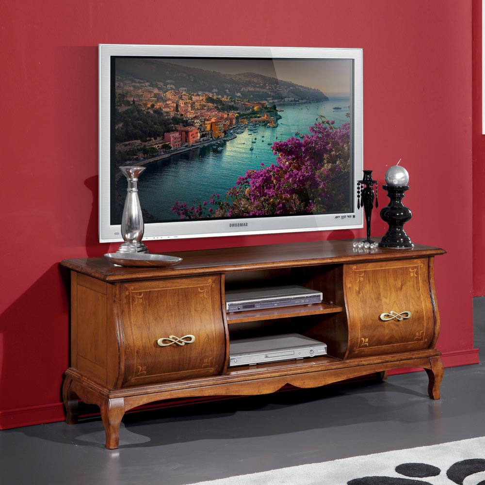 Classic style living room TV cabinet made of walnut wood with inlays , complete with two doors and practical compartments. Unique and refined, it is completely made in Italy by skilled master craftsmen , finished with wisdom and taste for elegance. The production is carried out using fine materials , and performing the workbyhand with the utmost care and professionalism that distinguishes Made in Italy products.