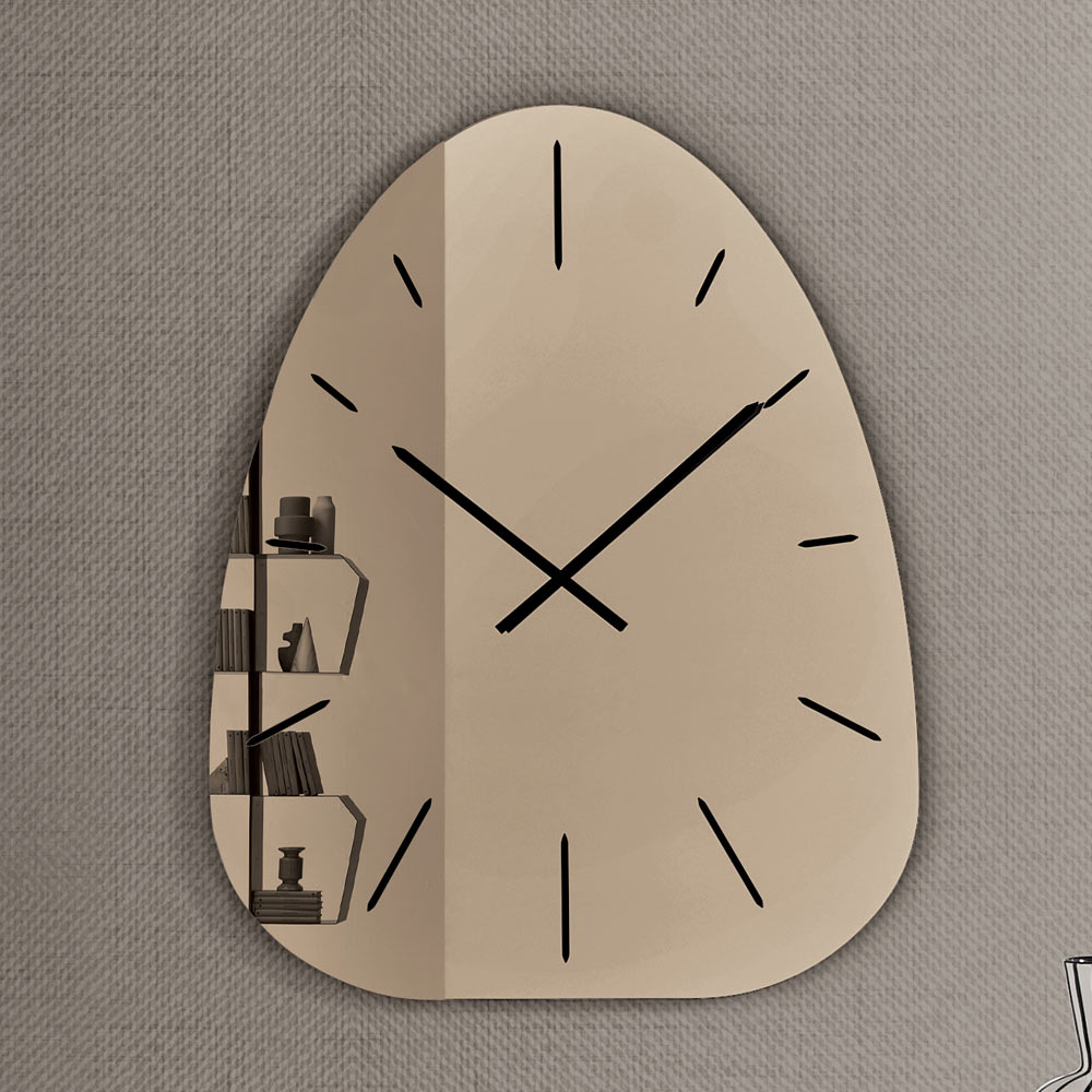 An elegant designer wall clock , ideal for enhancing spaces like the living room , entryway , or dining area . Its contemporary style transforms the function of time into a decorative element capable of enriching the wall with elegance and personality.