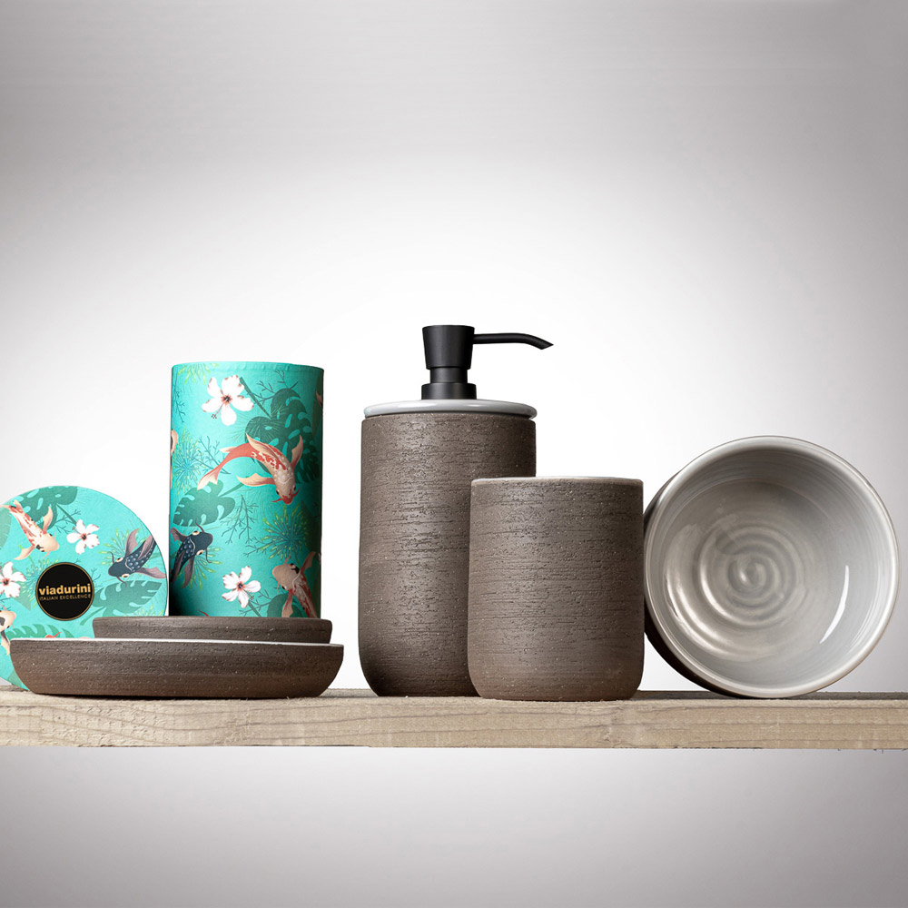 Free- standing bathroom accessories made of refractory clay and dark earths handmade in Italy enameled inside with a gray finish, a color capable of expressing elegance in a discreet and reserved way. Each element of the composition is characterized by particular details such as the neoprene pad on the base of the accessories to guarantee the protection of the support surfaces and the dispenser with pump in matt black metal to ensure optimal dispensing of the soap. The countertop accessories are elegant and fascinating, particularly functional with unique reflections that create exclusive atmospheres.