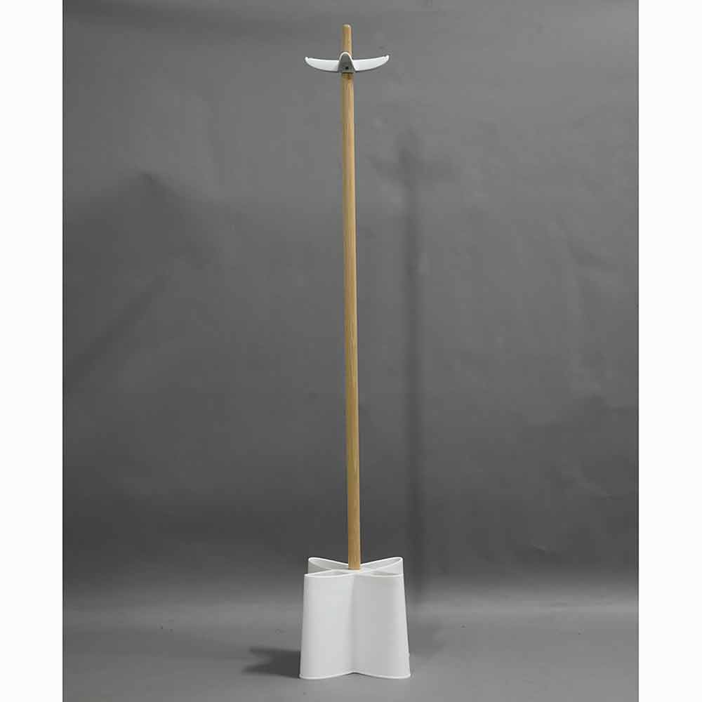 Modern coat stand with weighted base, beechwood structure and polypropylene details.
