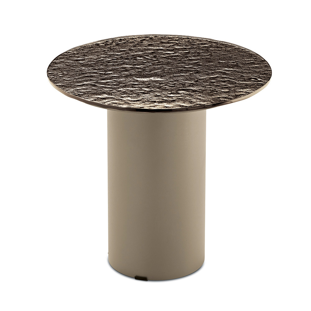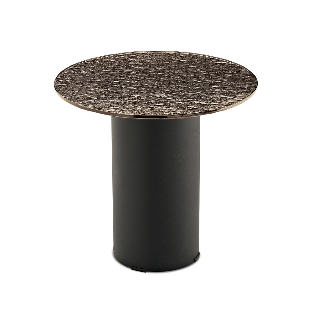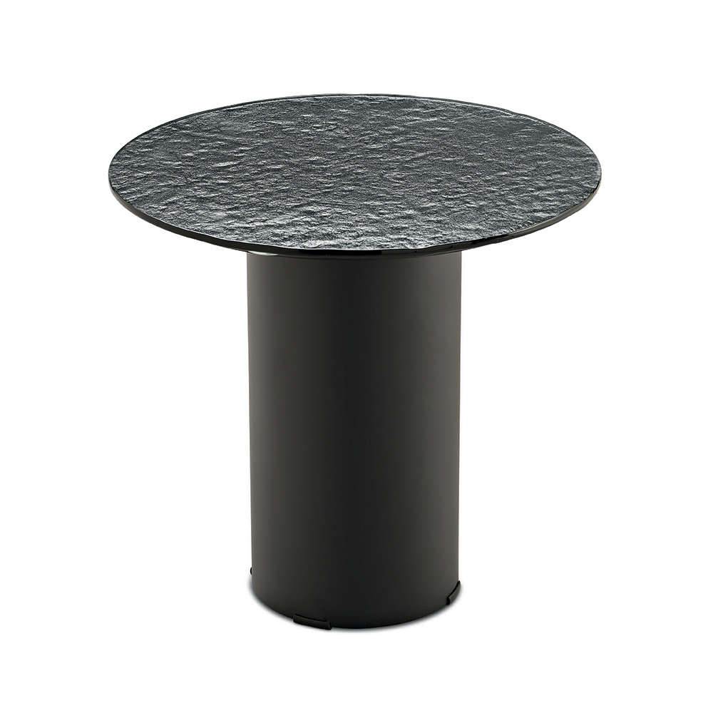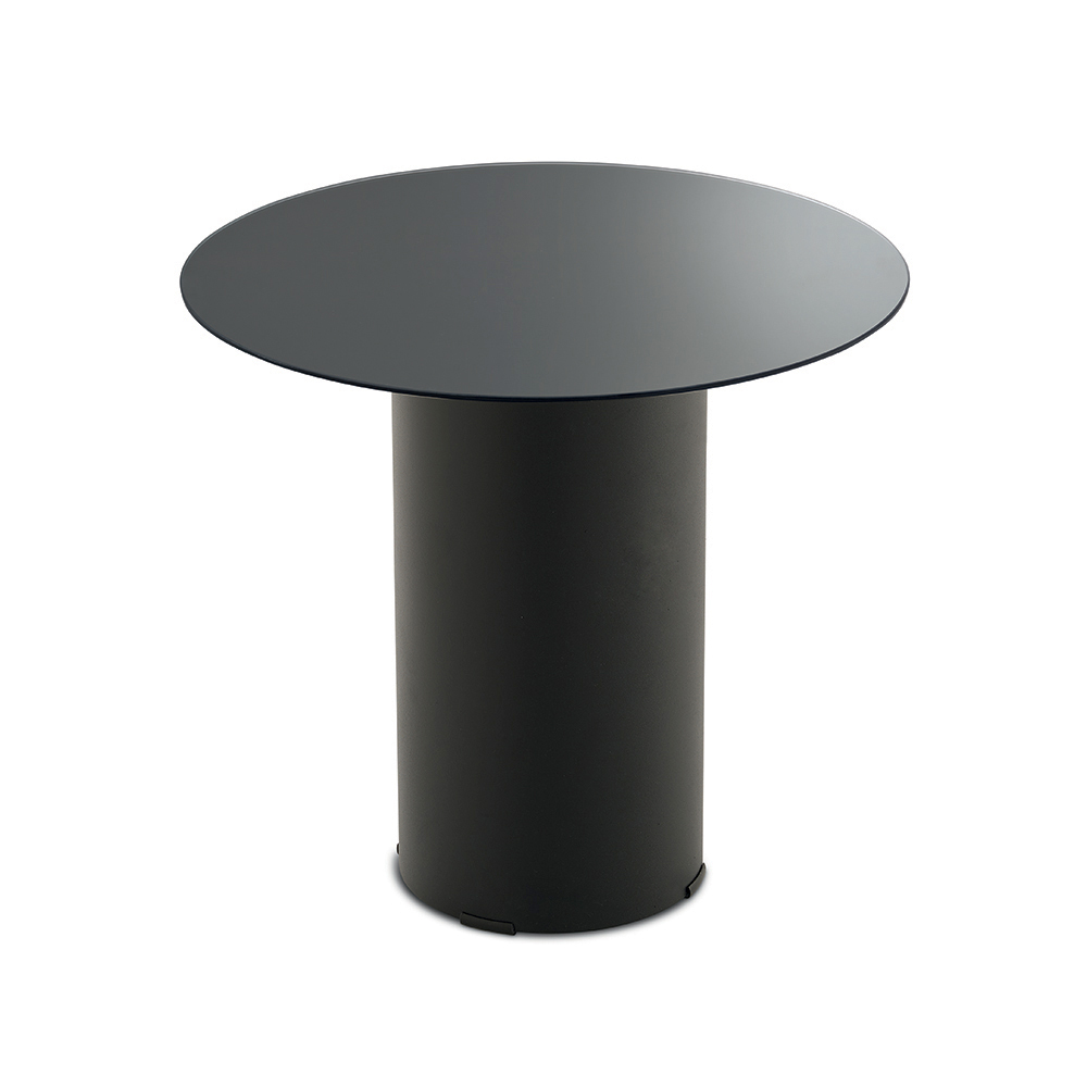 The structure features a cylindrical painted metal base , solid yet visually light, which balances the top. This contrast between solid volumes and thin surfaces creates a modern and elegant aesthetic, perfect for sophisticated spaces.