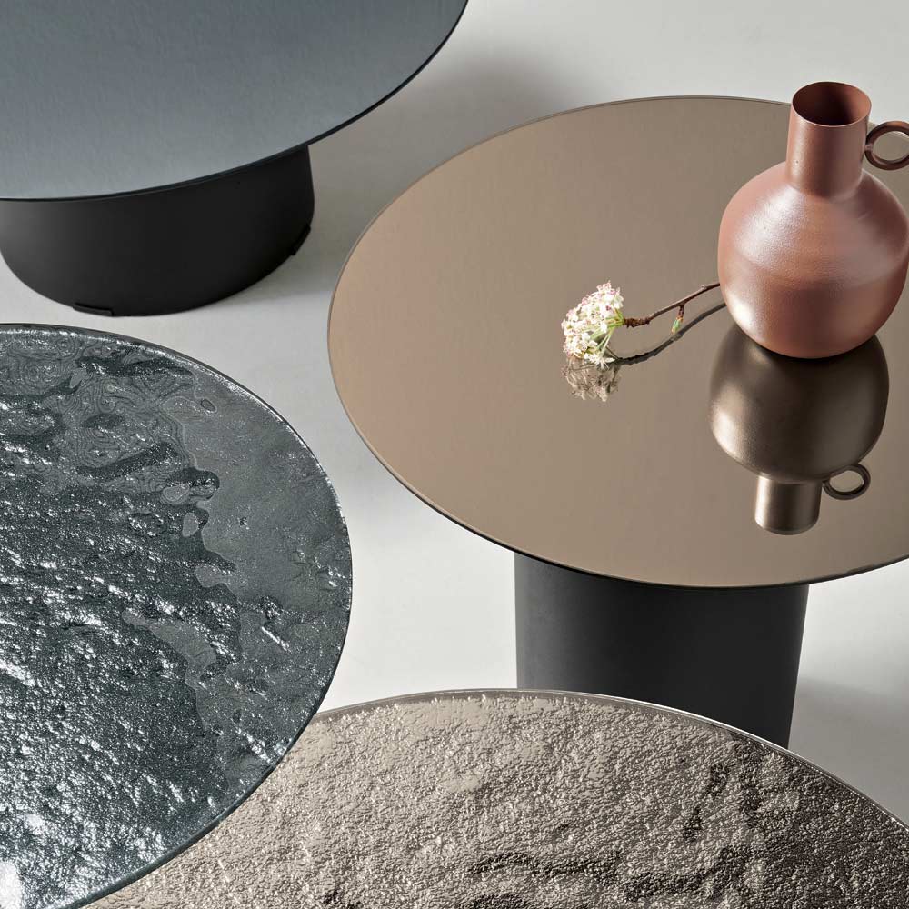 The top is available in back-silvered hammered glass or smooth mirror , both solutions designed to reflect light and enhance the space with distinctive visual effects. The option of combining finishes and colors allows you to customize the table to suit your style.
