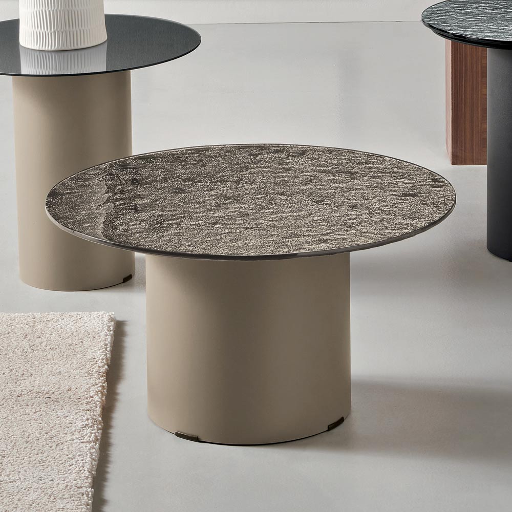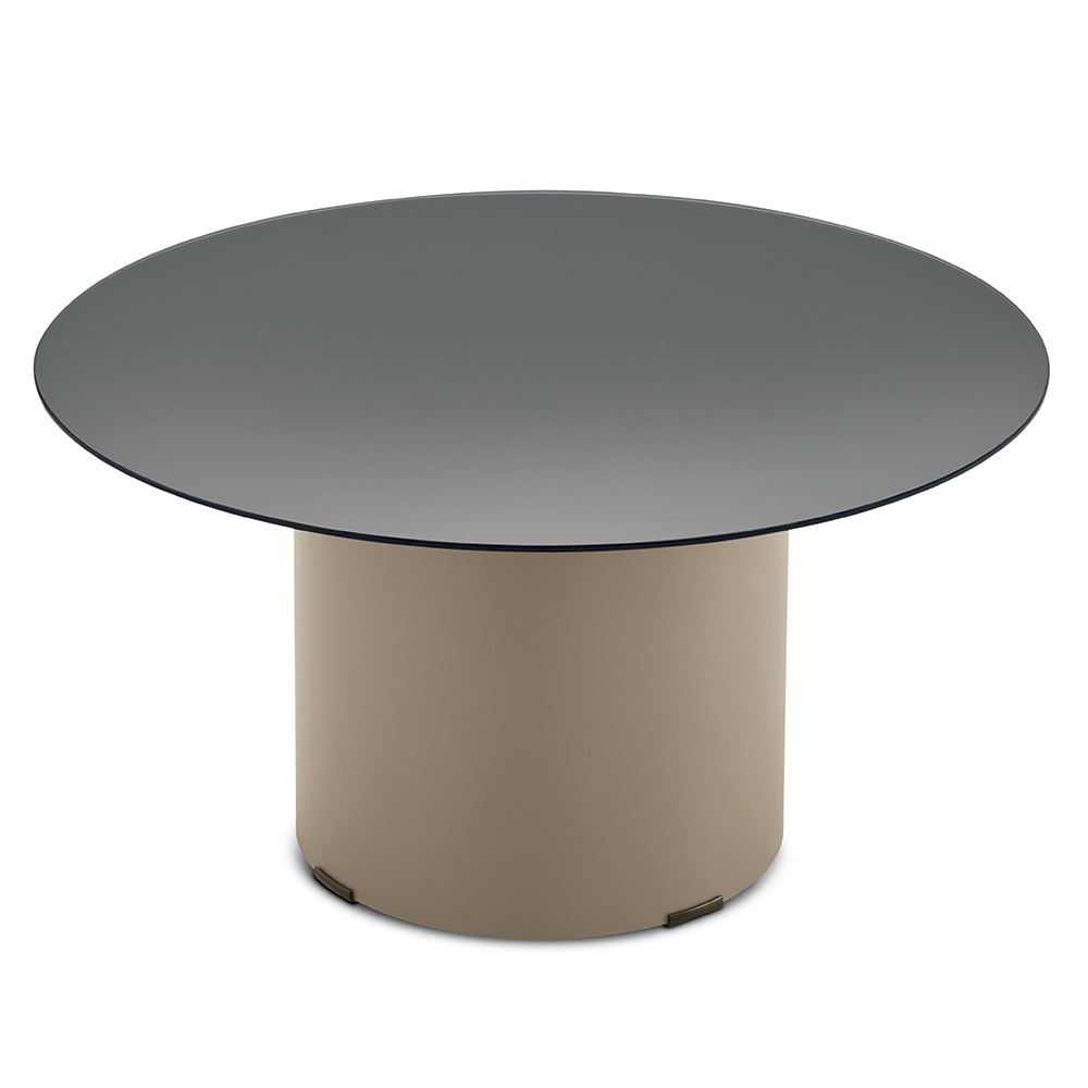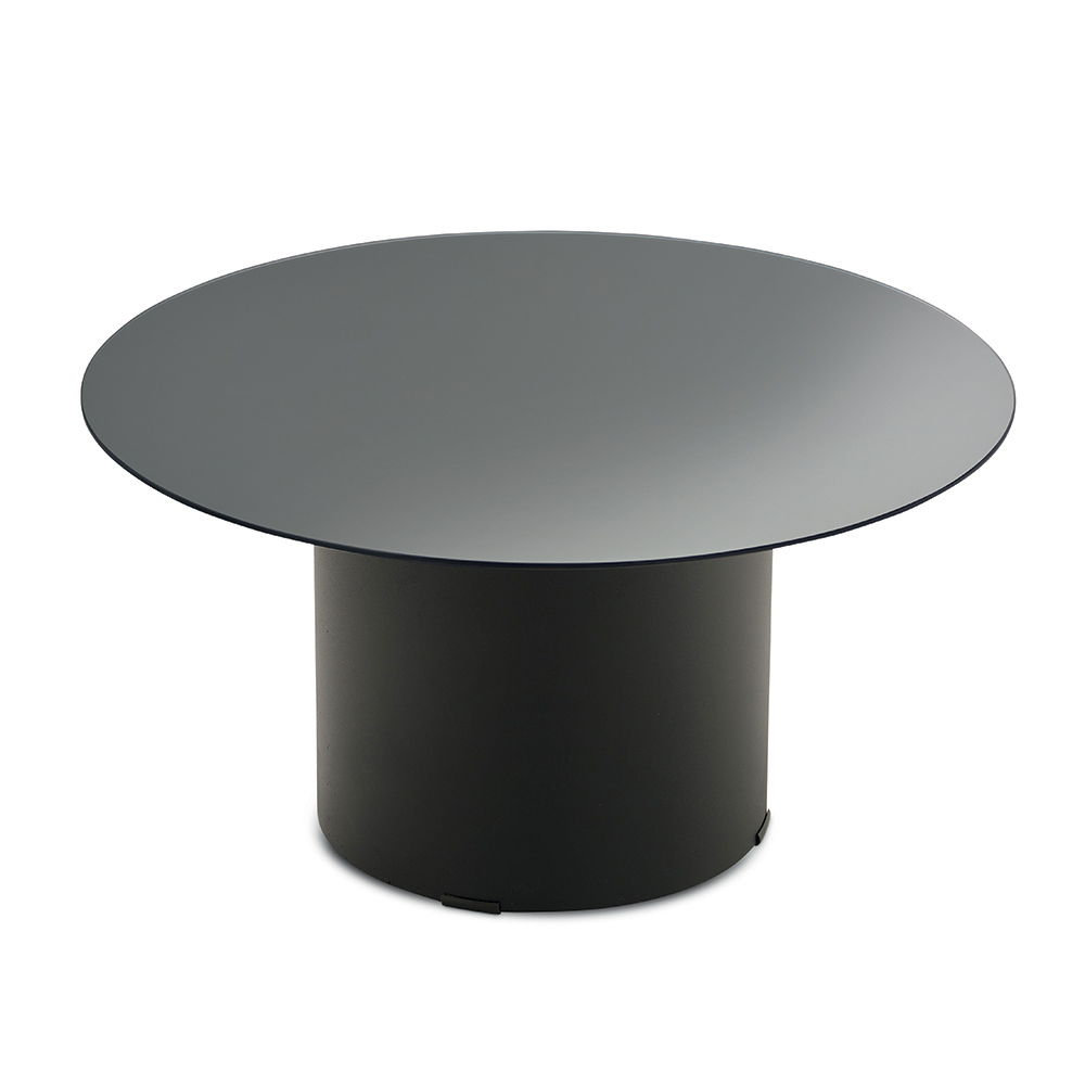 The structure features a cylindrical painted metal base , solid yet visually light, which balances the top. This contrast between solid volumes and thin surfaces creates a modern and elegant aesthetic, perfect for sophisticated spaces.