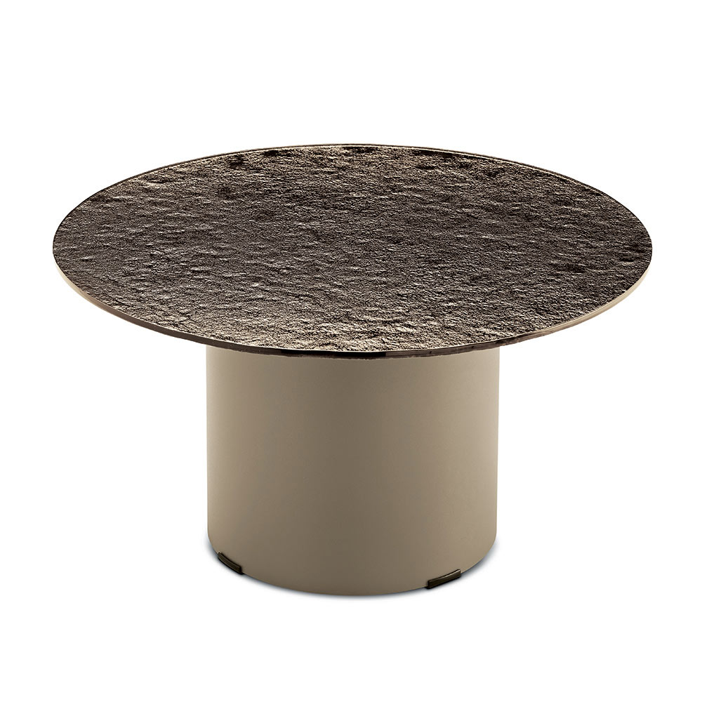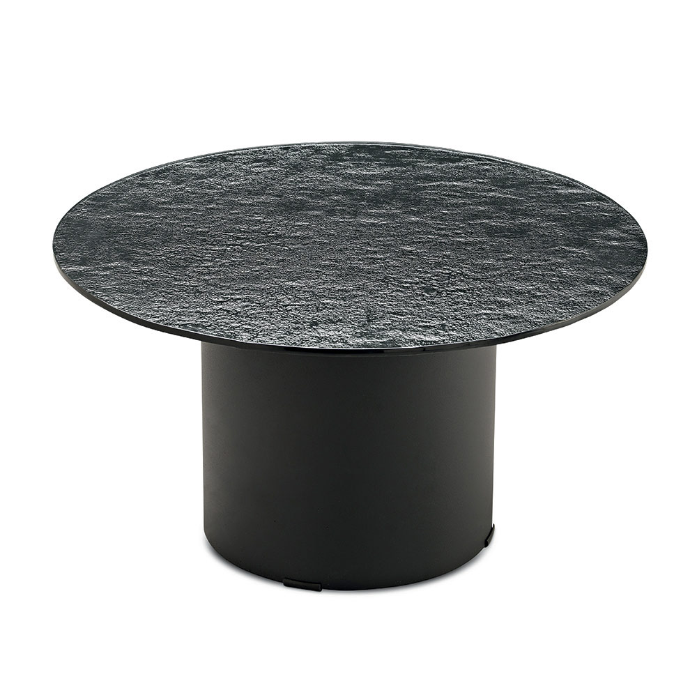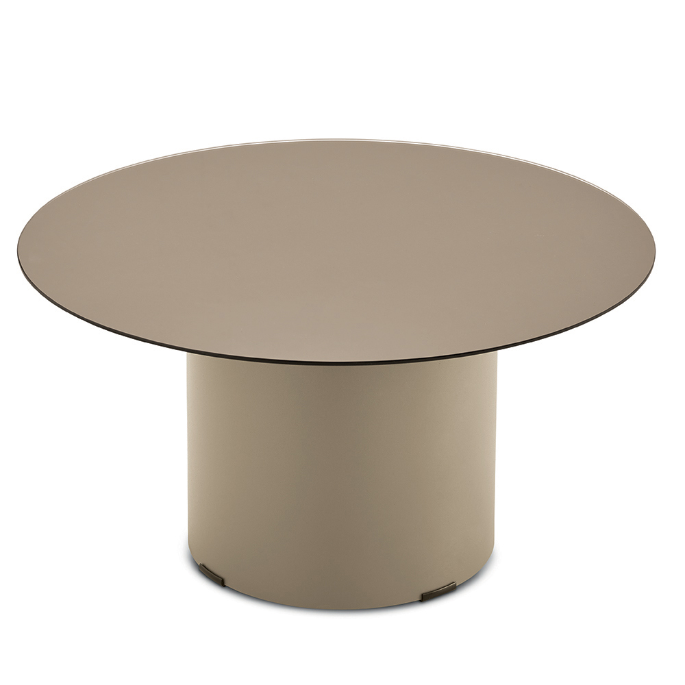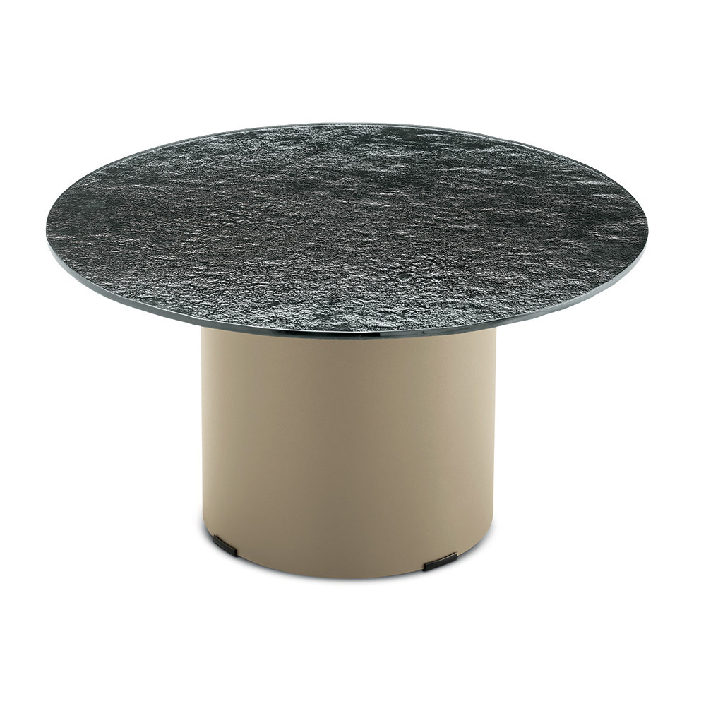 The structure features a cylindrical painted metal base , solid yet visually light, which balances the top. This contrast between solid volumes and thin surfaces creates a modern and elegant aesthetic, perfect for sophisticated spaces.