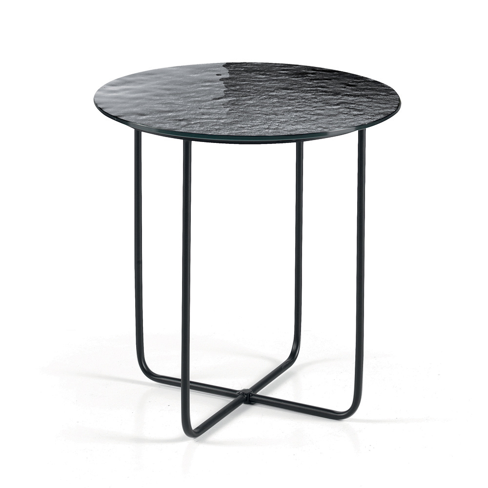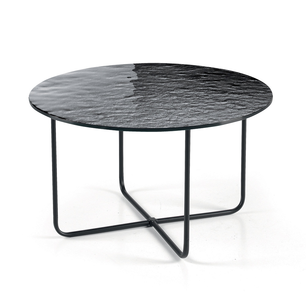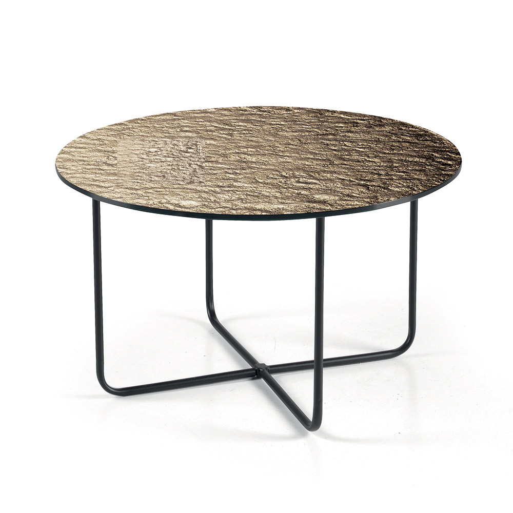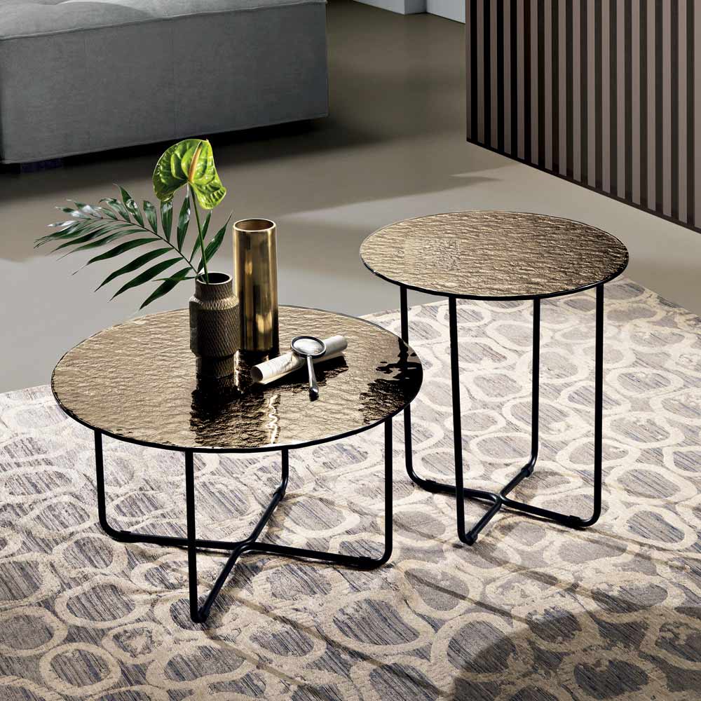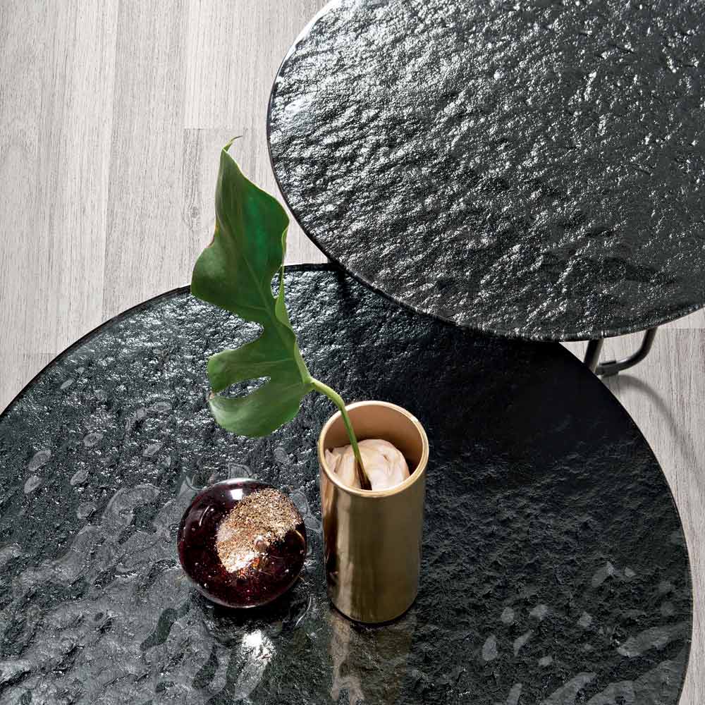 The top is available in back-silvered hammered glass , which amplifies the brightness of the space, or in marble-effect ceramic layered on glass , a solution that combines durability and aesthetic refinement. This dual option allows you to customize the table to suit the style of the room.