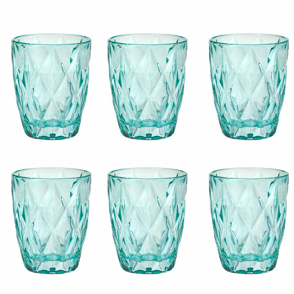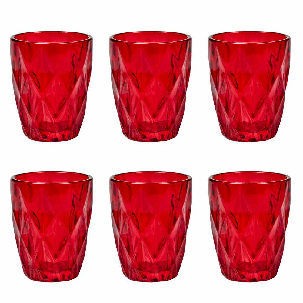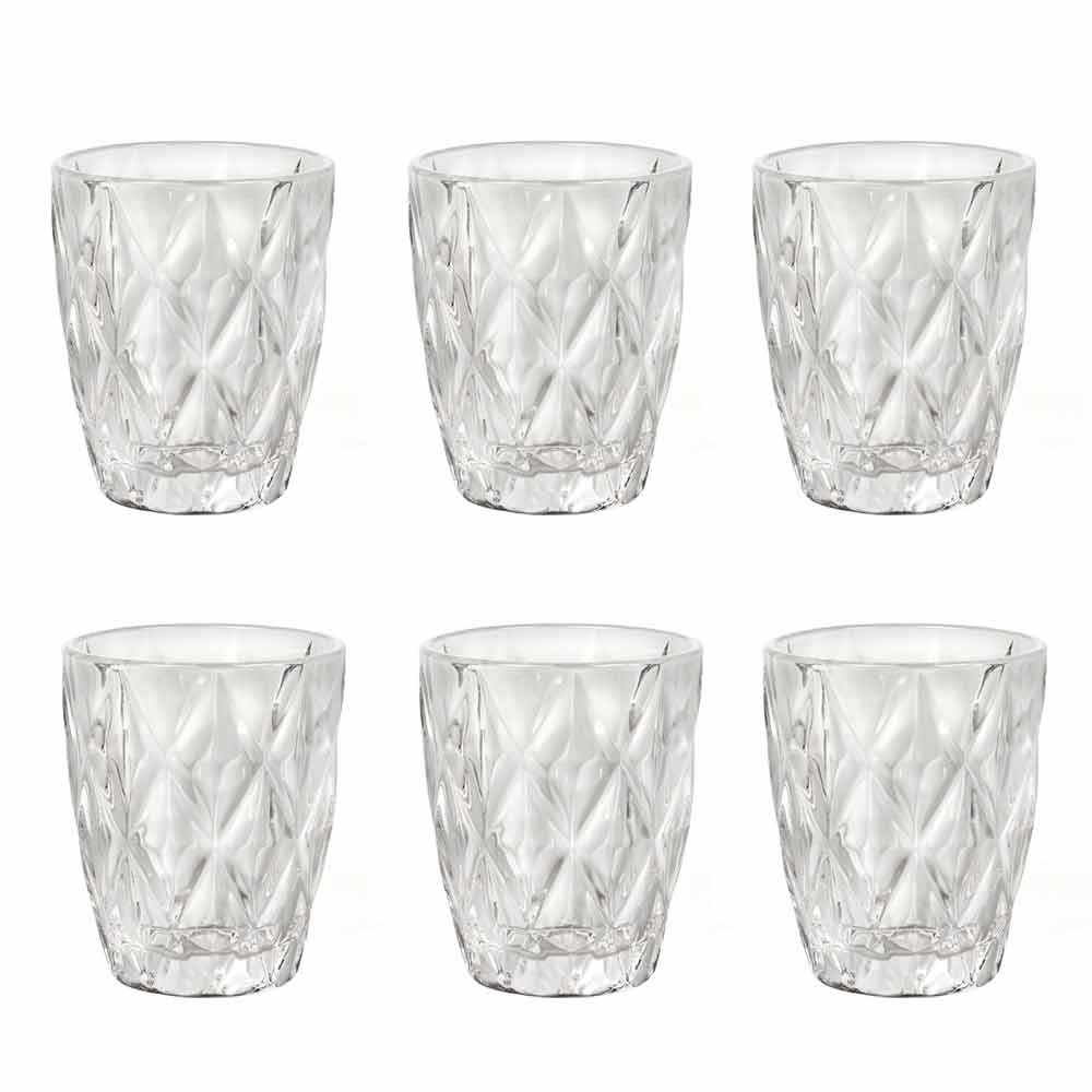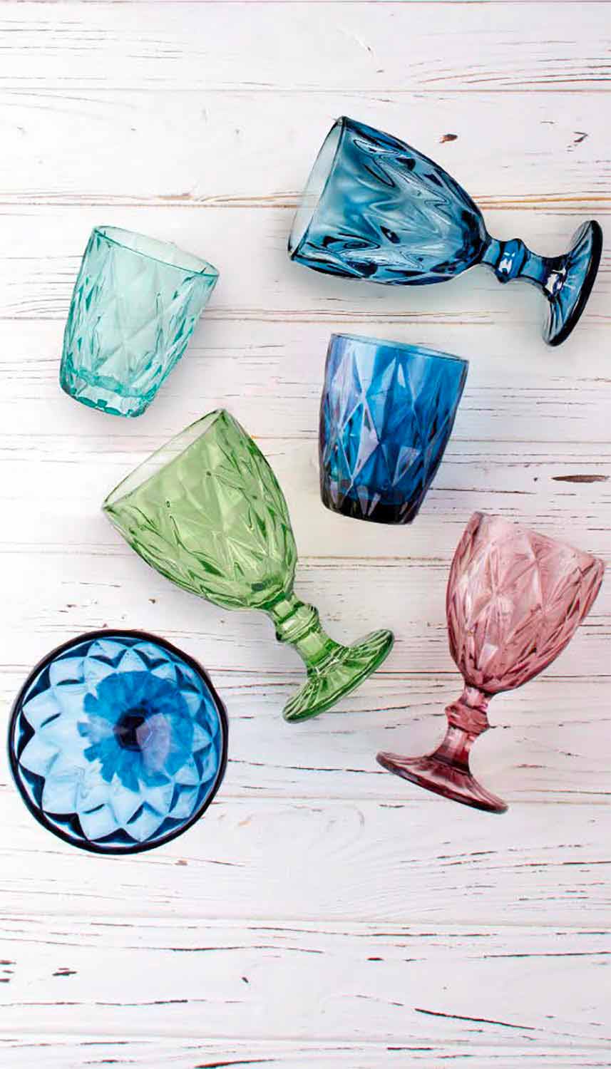 The colored glass glasses bring a touch of elegance and sophistication to the table, thanks to the precious diamond carving and the brilliance of the material. In the transparent version or in the 6 bright colors available, you can find all the combinations you want, to give contrast and color to the dishes on the table, giving life to always new tables. A multicolor version is also available for an unprecedented fusion effect.