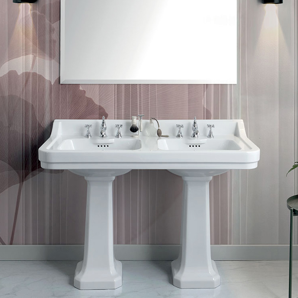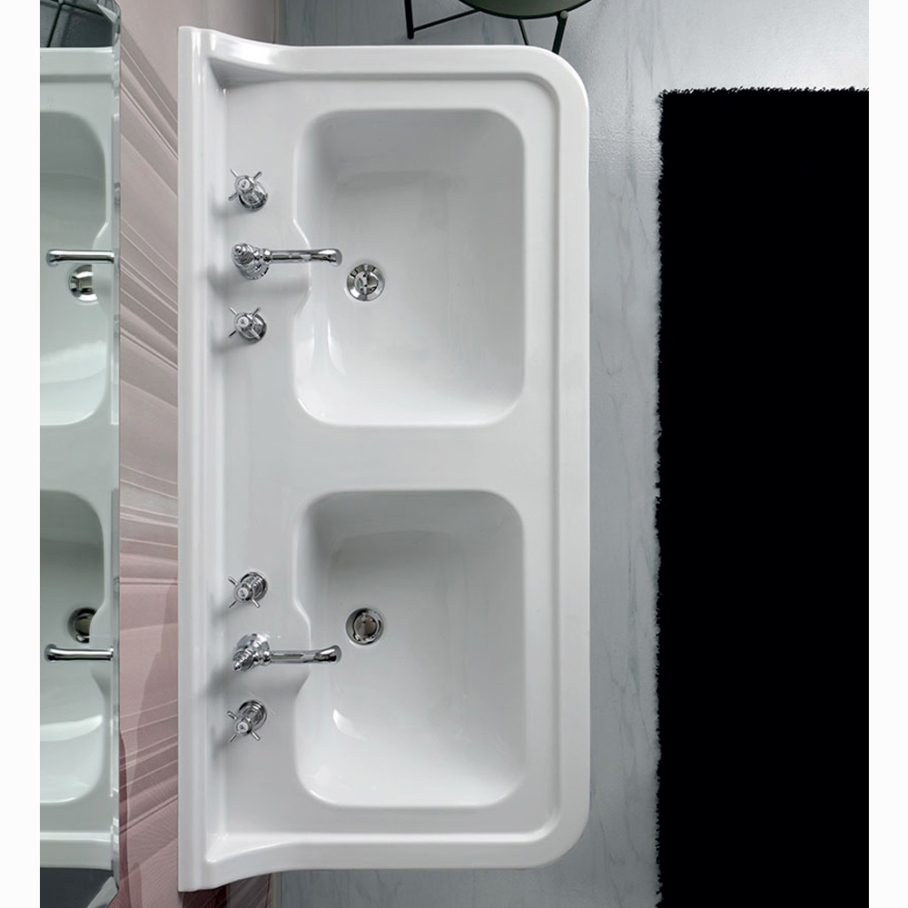 Console washbasin with double basin made of glossy white ceramic through a 100% Made in Italy artisan production . A piece of furniture that brings to life classic designs of yesteryear to furnish equally classic bathroom areas with character but also modern environments in which to play on original and unprecedented style contrasts .