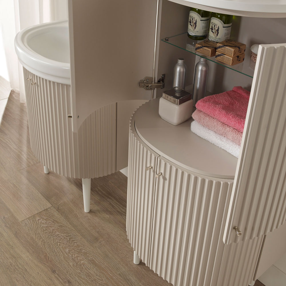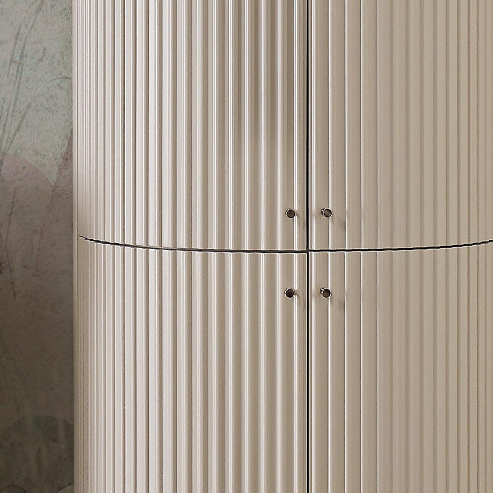 MDF tall unit with four cannetté doors noisette-colored matt finish which close off three shelves, two of which in glass and one in Hydro MDF. The top shelf and the legs are in a matt white finish and the knobs are included in a nickel finish.