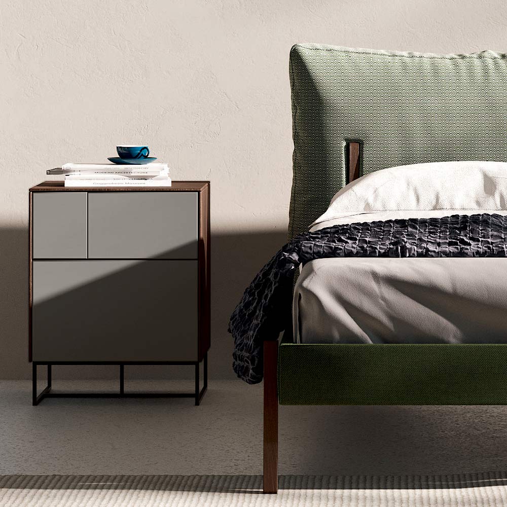 burnished metal base . A furnishing idea that comes from a careful study of proportions and sizes to create a solution underlined by strong contrasts between shapes and materials. The bed is characterized by the wooden details that enrich the figure making it original and particularly modern and by the two large and