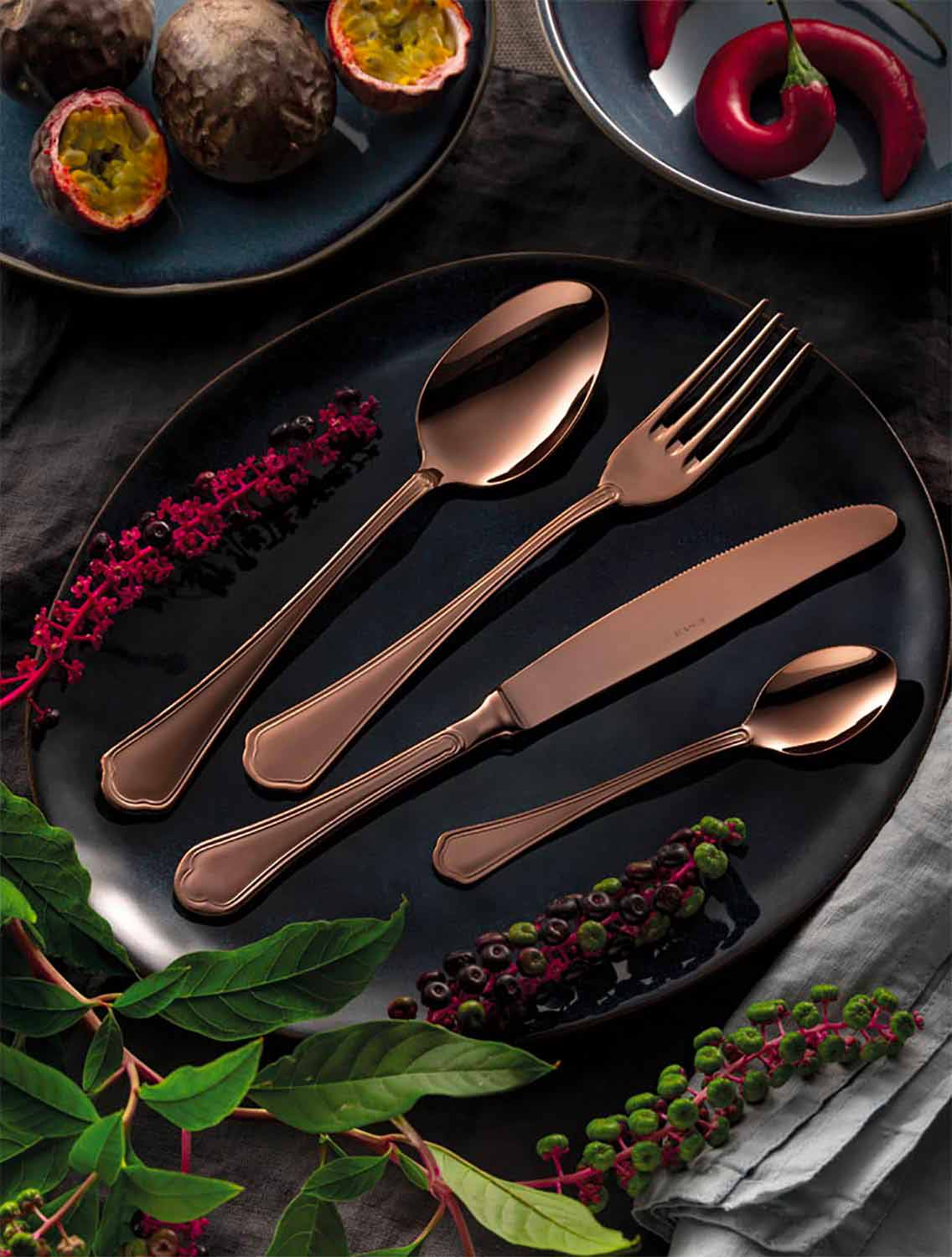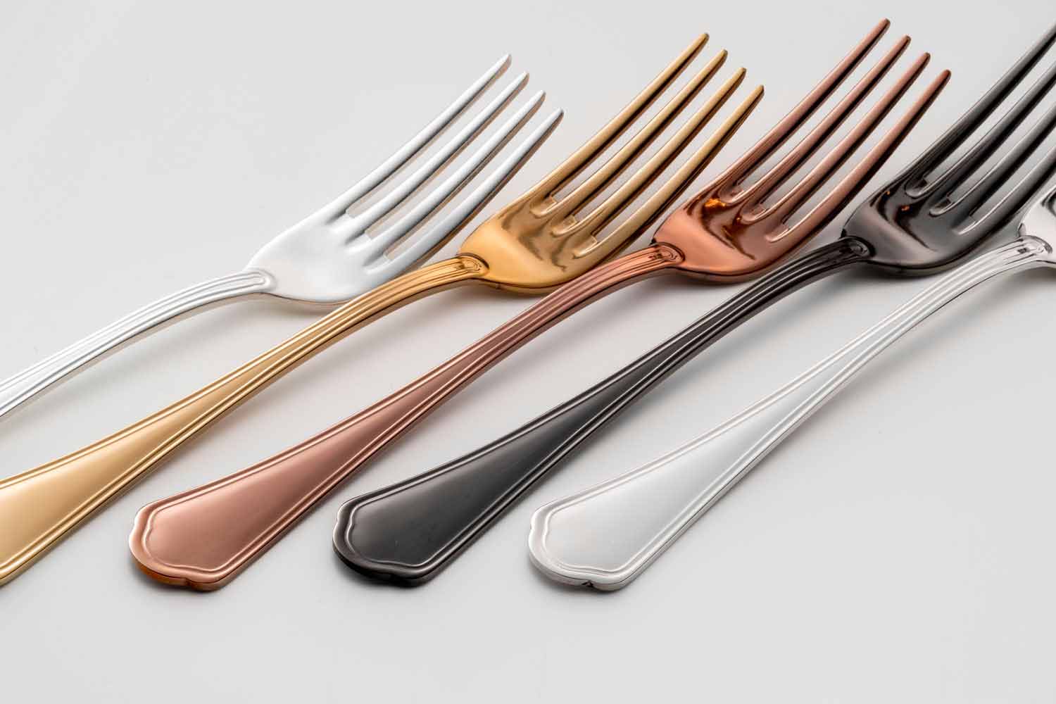 PVD is the acronym for Physical Vapor Deposition, which is a technology used to color steel in special vacuum chambers where very thin metal films are steam sprayed, which condense on the cutlery. This treatment, with a range of wonderful shades of color, in addition to embellishing the cutlery, makes them more